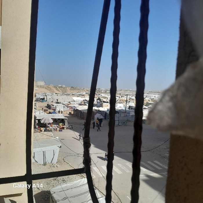 An outdoor scene viewed through a barred window captures a dusty, sunlit cityscape. Makeshift shelters and small buildings cluster along a road with pedestrian crossings. People are visible in the sce…read more