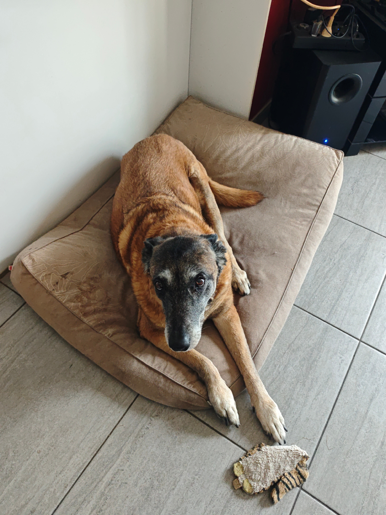 A medium-sized, brown and grey dog rests on a tan dog bed in a room with grey tiled floors. The dog is positioned in the center of the frame, looking directly at the camera. Its front paws extend off…read more