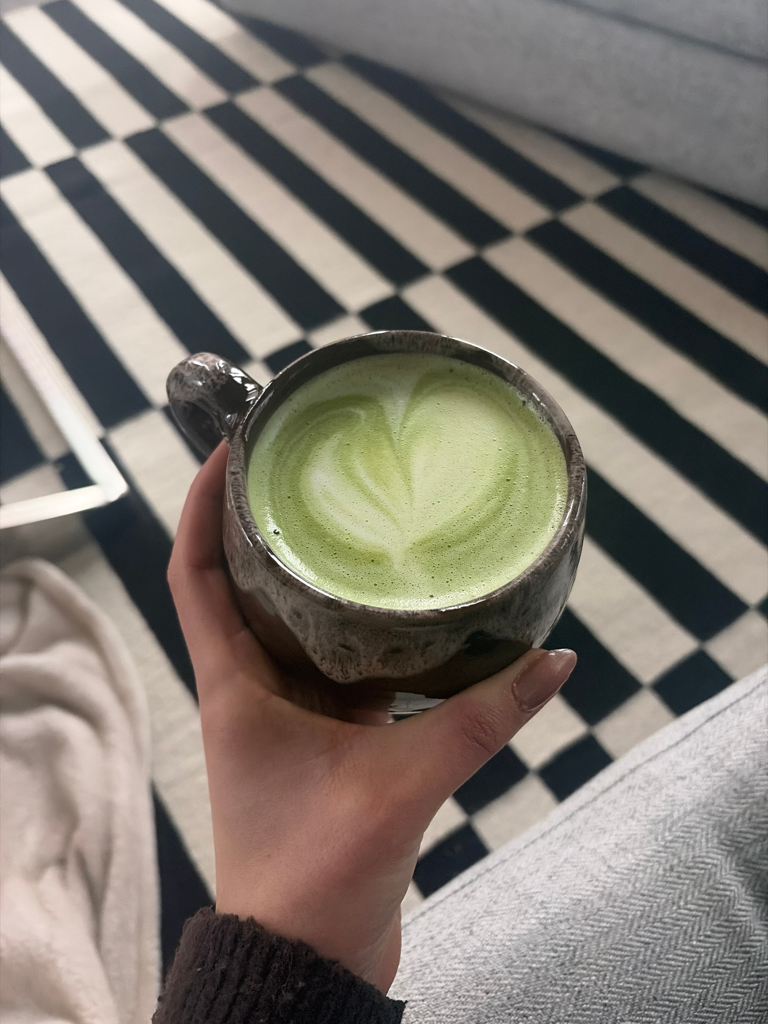A hand holds a ceramic mug filled with a green beverage, likely a matcha latte, against a backdrop of a black and white checkered floor or rug. The hand is light-skinned, with manicured nails. The sle…read more