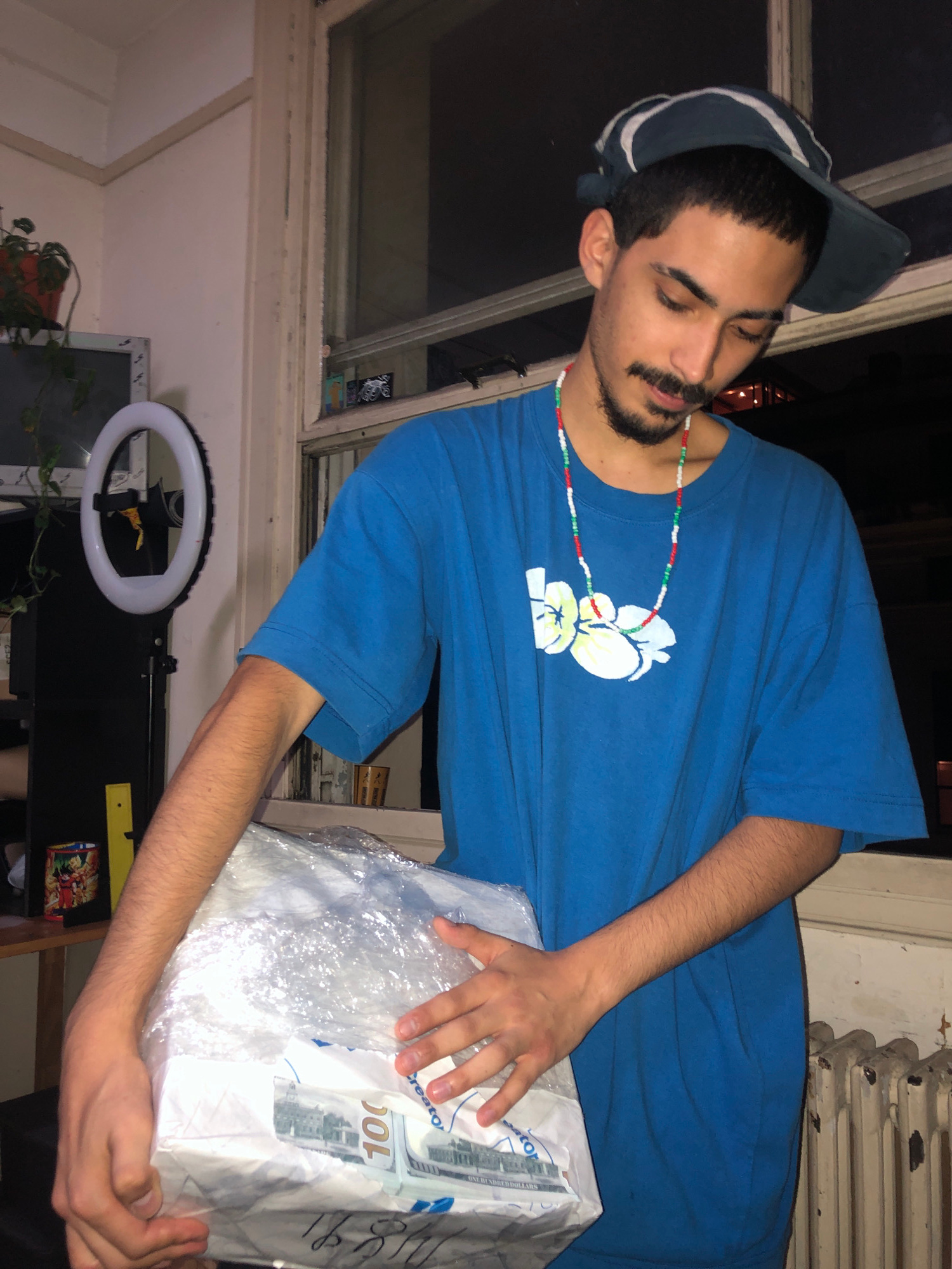 A man is holding a package wrapped in clear plastic and white paper with $100 bill imagery. He is wearing a blue t-shirt with a white floral design and a cap. He also has a beaded necklace. The backgr…read more