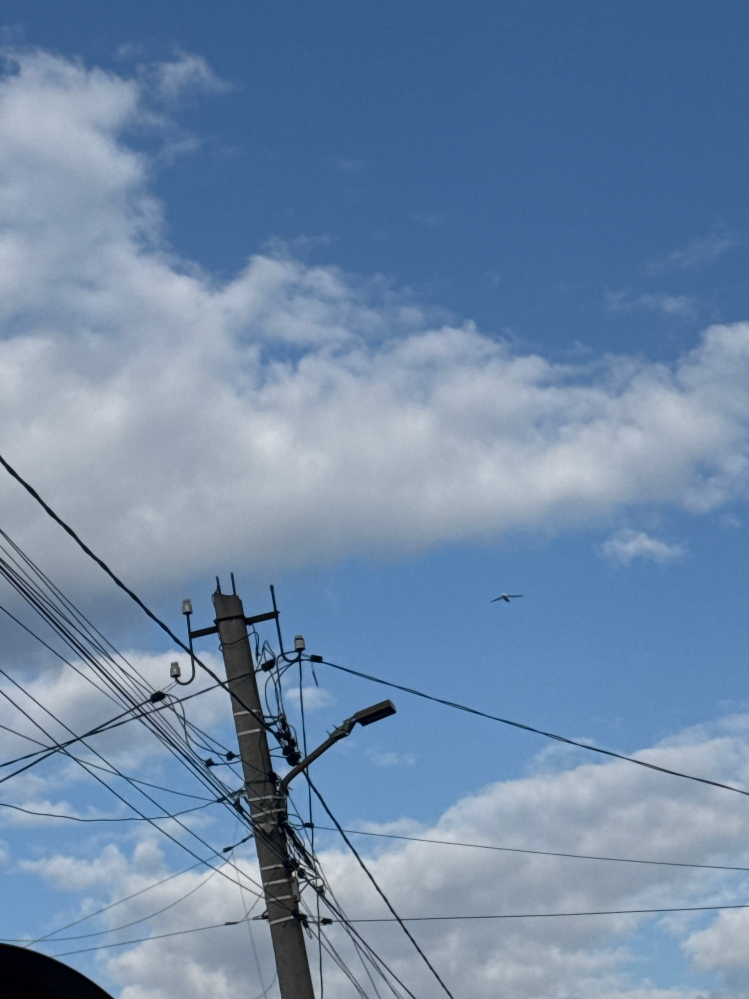 This upward-looking photograph depicts a segment of the sky above Rostov-on-Don, Russia, characterized by a bright blue expanse interspersed with white and light grey clouds. The image captures a cont…read more