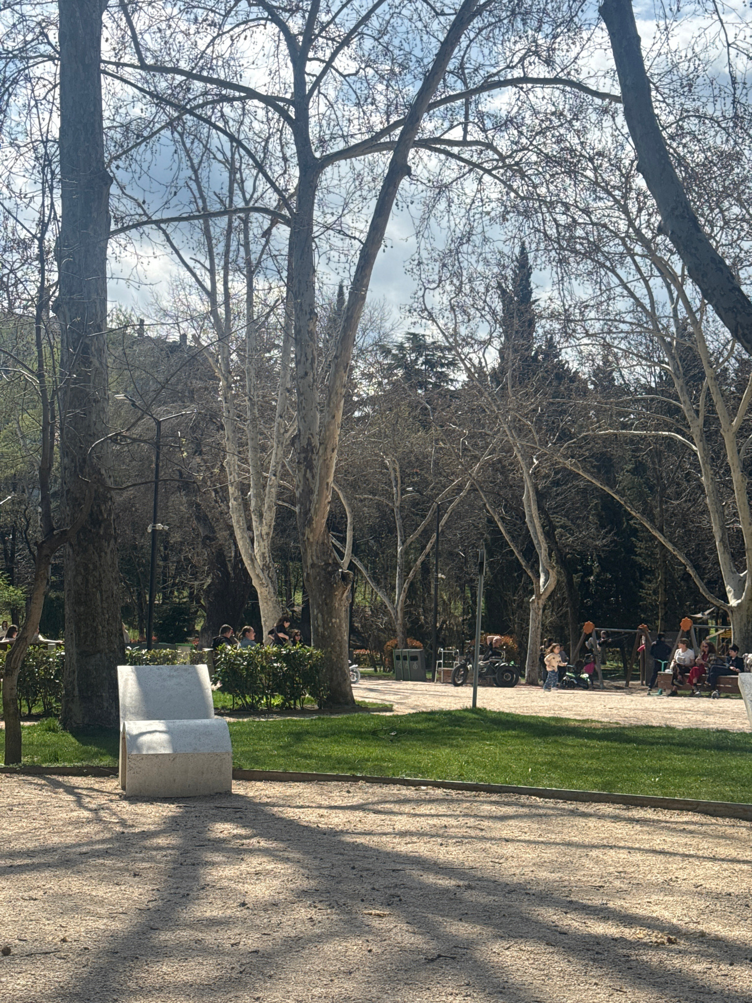 The image shows a park scene in Tbilisi, Georgia. The foreground features bare trees lining a gravel path with park benches. To the right is a grassy area, beyond which is an outdoor exercise area wit…read more