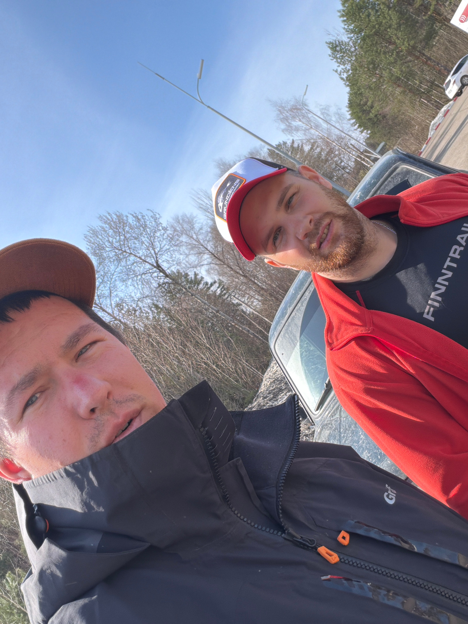Two men are in the frame. The man on the left is wearing a red jacket over a black shirt with "FINNTRAIL" printed on it, and a red and white baseball cap with a visible logo that reads "GRUNDENS" in w…read more