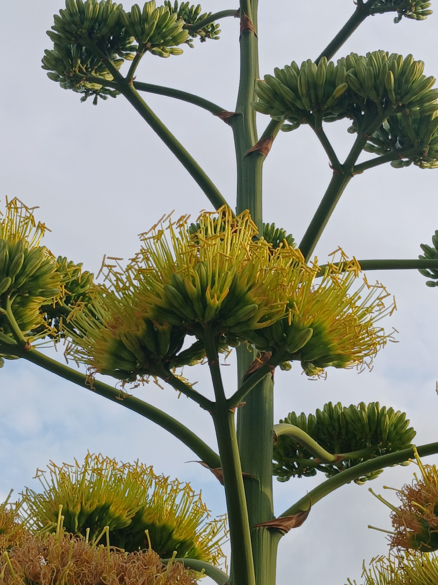 The image shows a flowering agave plant against a light sky, likely taken in Guayana City, Venezuela. The plant has a tall, green stalk with clusters of buds and flowers branching off. Some flowers ar…read more