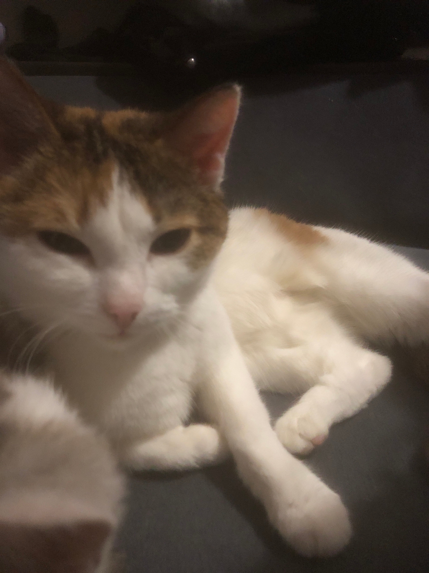 A cat lies on a grey surface, its white belly exposed. The cat is mostly white with orange patches. Its legs are crossed. The photo is blurry. The location is not deducible from the visual data.