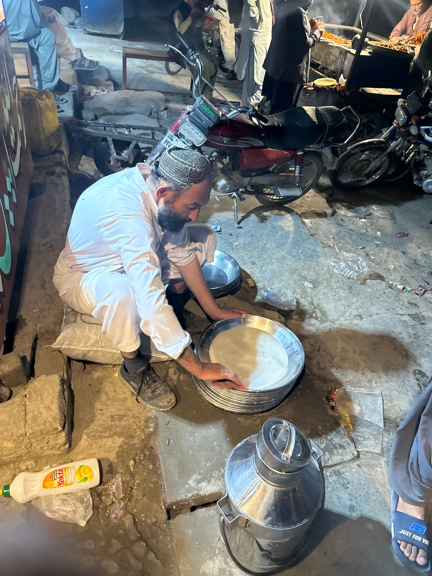 The image shows a man working on the ground in Quetta City Tehsil, Pakistan. He is wearing a white shalwar kameez, a small cap, and dark shoes. He is positioned between a metal container with a white…read more