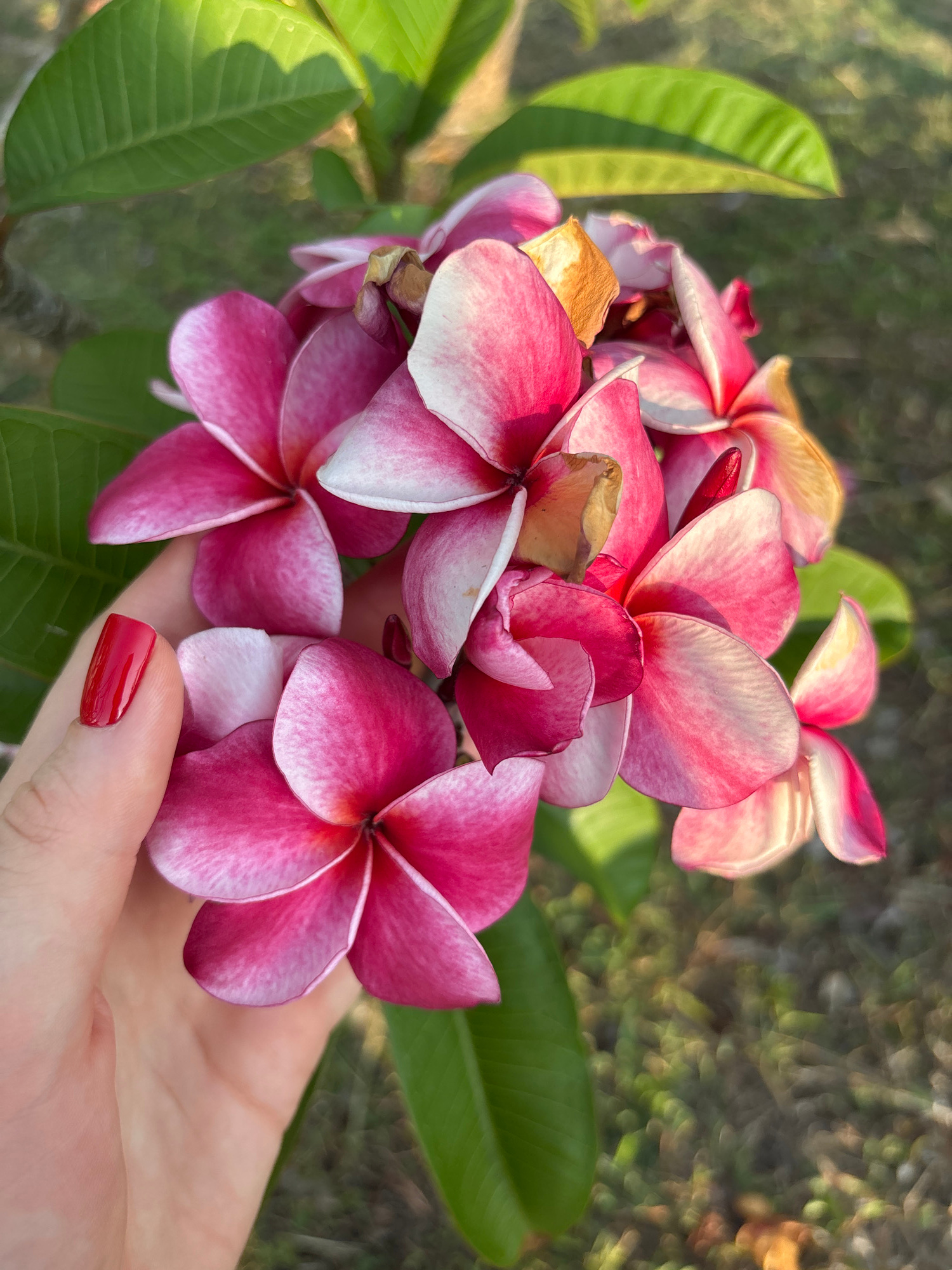 The image presents a close-up, outdoor view of a cluster of vibrant Plumeria (Frangipani) flowers, gently held by a human hand. The flowers are the central subject, displaying shades of rich pink that…read more