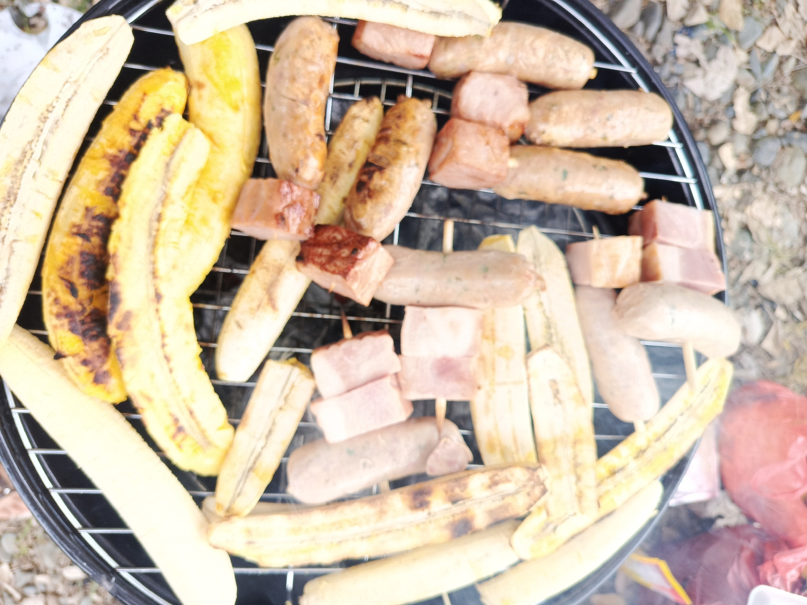A charcoal grill is filled with plantains, sausages, and cubes of meat, likely bacon, cooking on a grill grate. The grill is outdoors, possibly in a natural area near the city of La Maná, Ecuador, as…read more