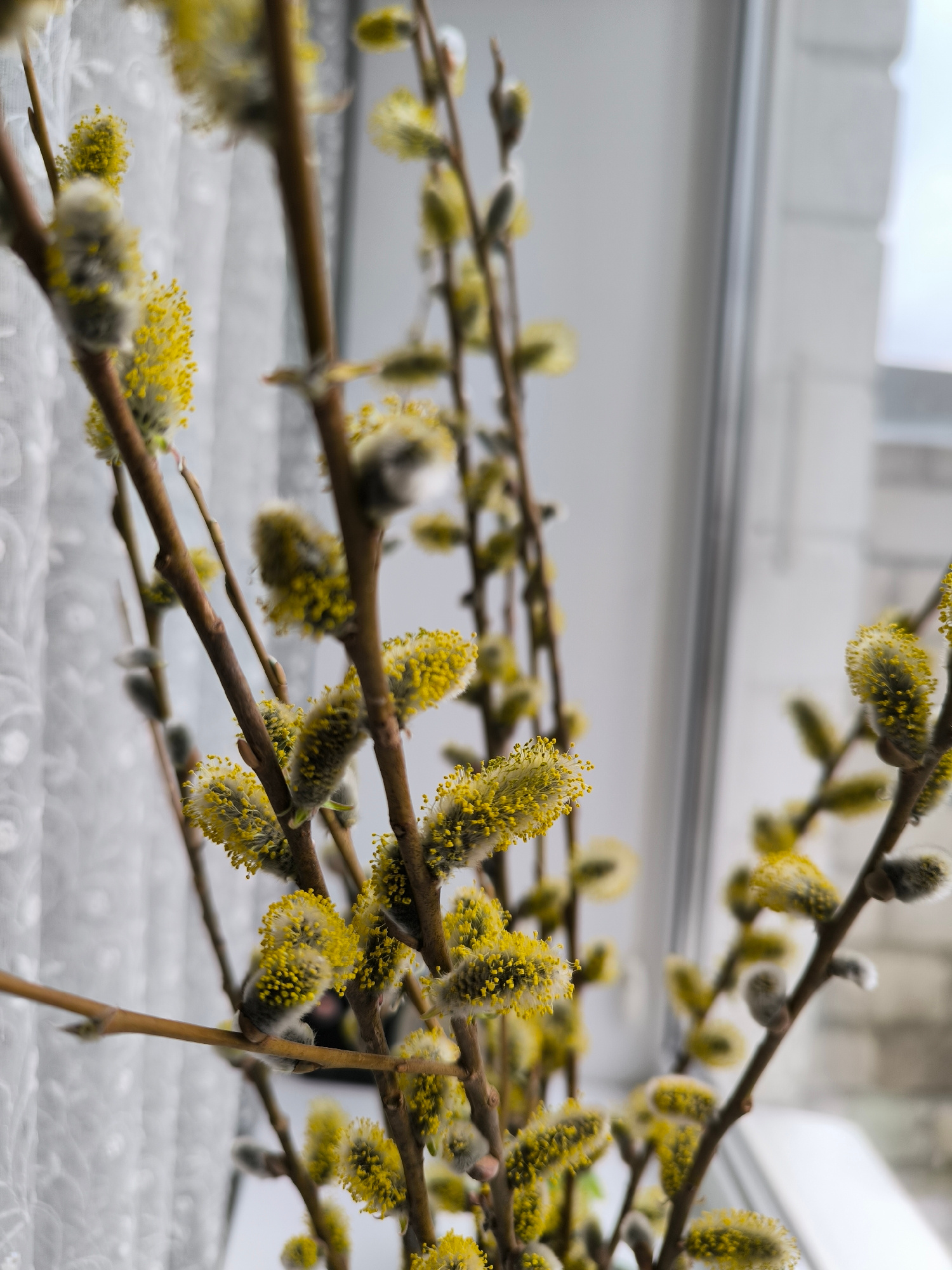 The image shows a close-up of blossoming pussy willow branches, likely indoors, in Vinnytsia, Ukraine. The branches are light brown with fuzzy, yellowish-grey catkins. A white lace curtain is partiall…read more