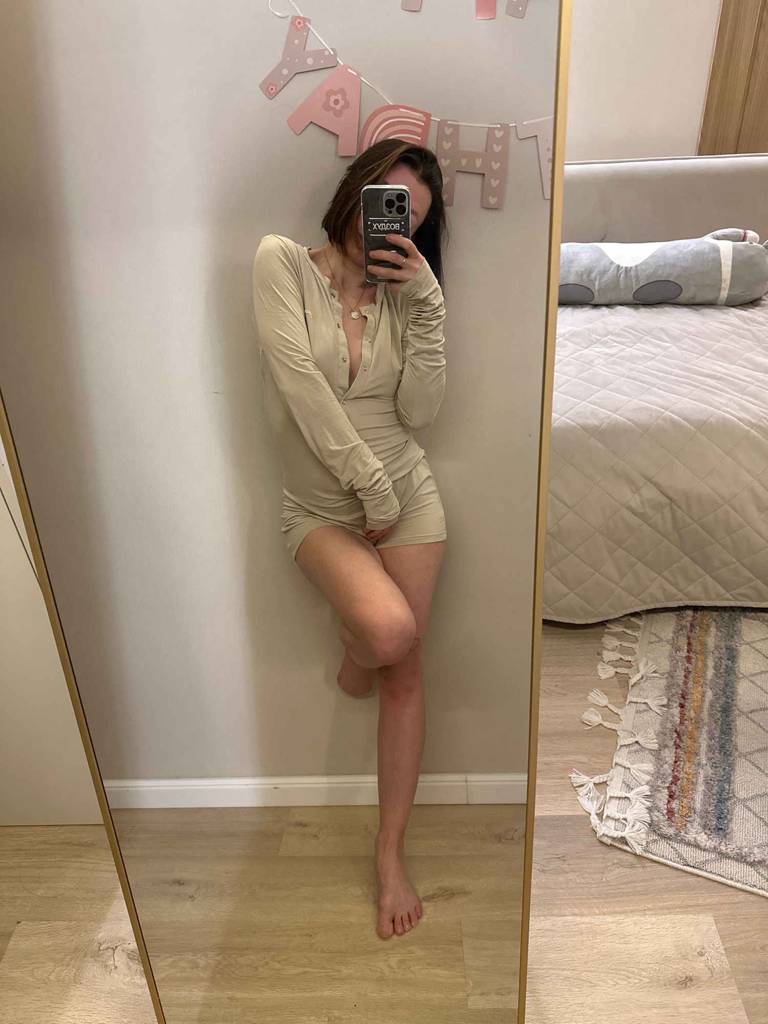 A woman is visible in a mirror reflection. She is lying on her side, wearing a light-colored long-sleeved garment and holding a smartphone in front of her face to take a picture. A bed with pillows is…read more