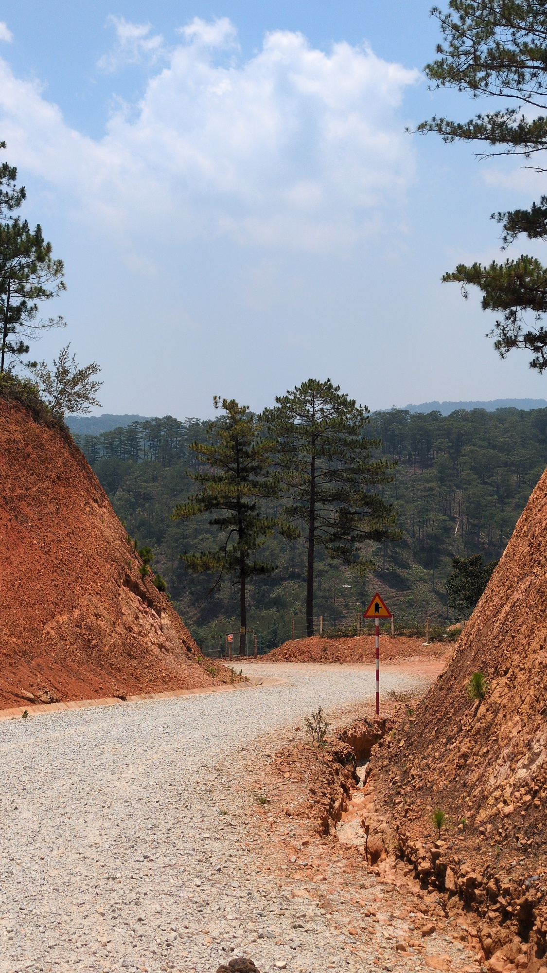 A slightly tilted medium shot reveals a gravel road cutting through a landscape in Lạc Dương, Vietnam. To the right, a steep, rocky, reddish-brown bank rises, while on the left, the bank descends. Veg…read more