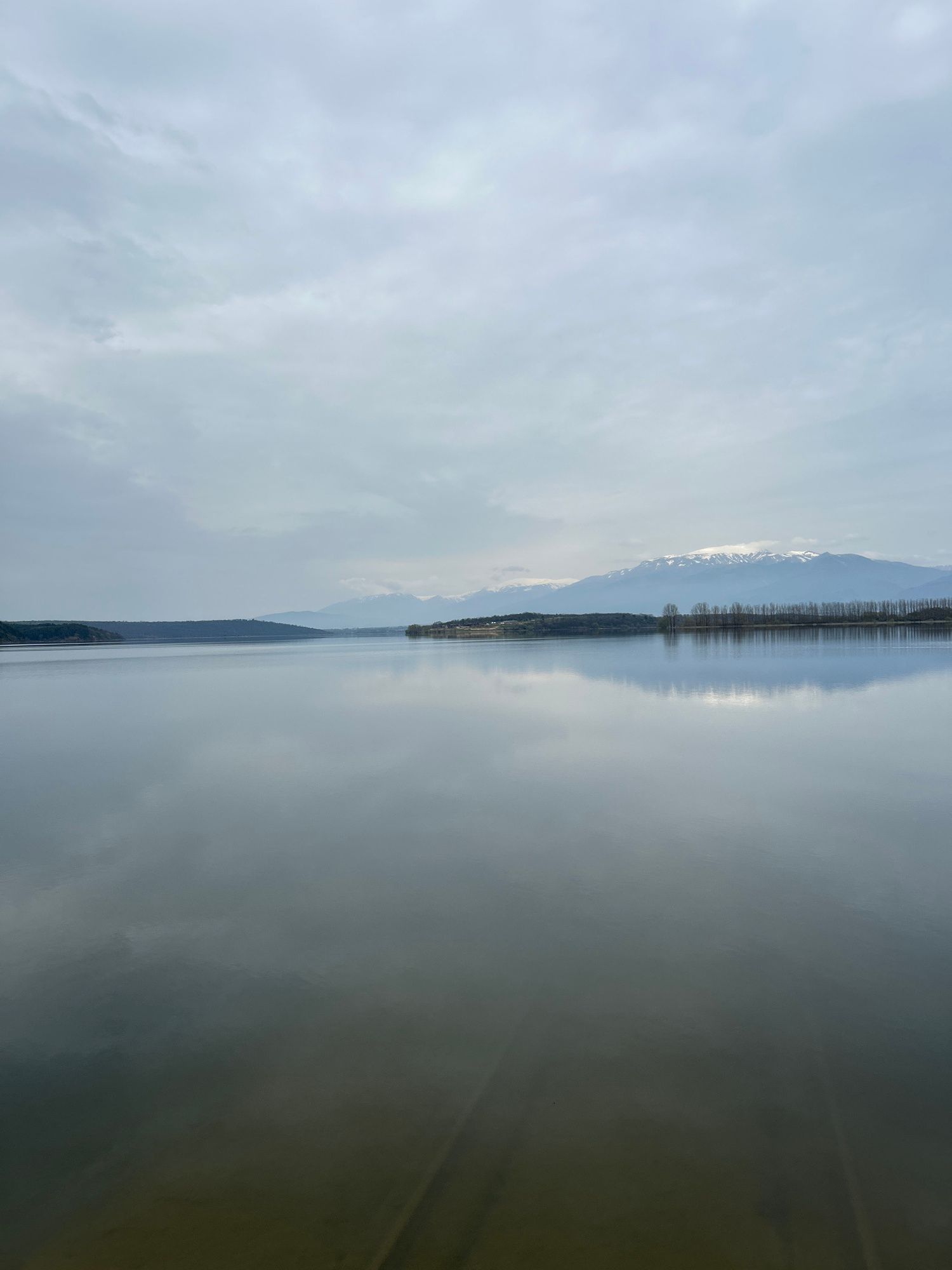 The image shows a landscape in Koprinka, Bulgaria. A body of water, possibly a lake, dominates the scene. Its surface appears calm, reflecting the sky. In the background, there are mountains with someβ¦read more