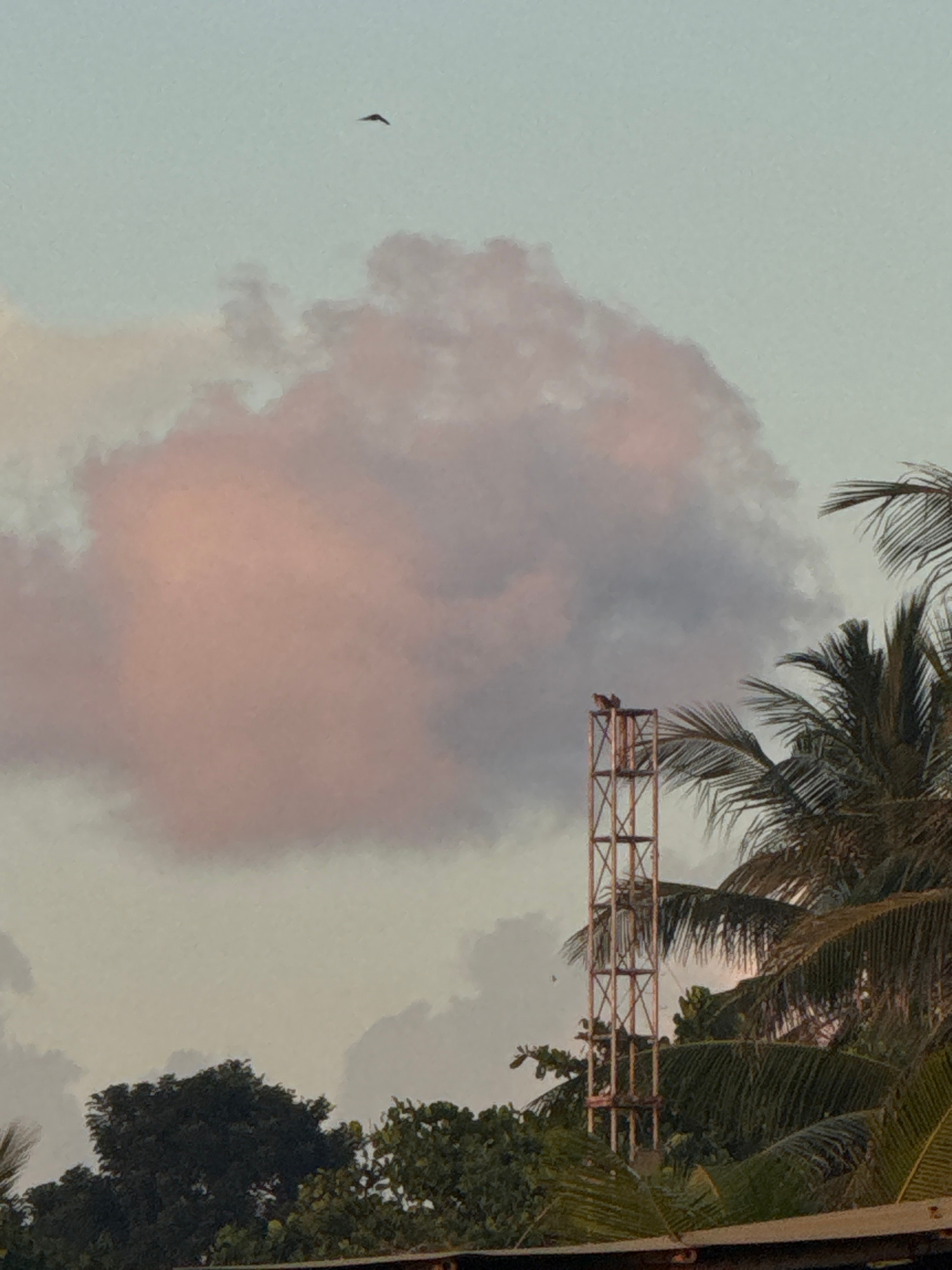 The image shows a cloud formation in Kuta Selatan, Indonesia, with a bird flying in the foreground. Palm trees and a metal structure are visible in the upper right portion of the frame. A person is si…read more