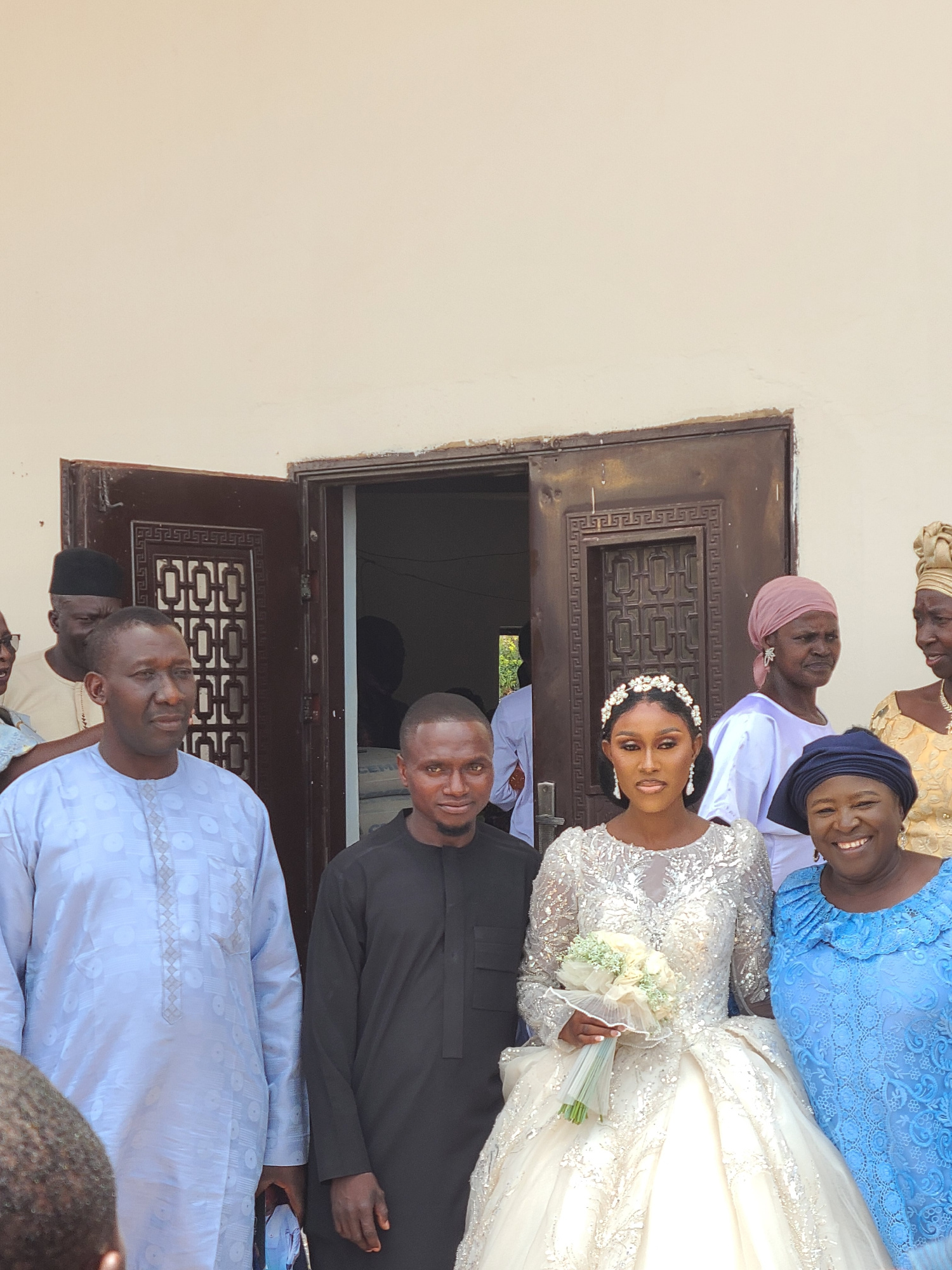 The image captures a group of people, likely at a wedding, outside a building in Barakin Lerawi, Nigeria. The bride is wearing a white, sparkly gown and holding a bouquet of white flowers. She is flan…read more