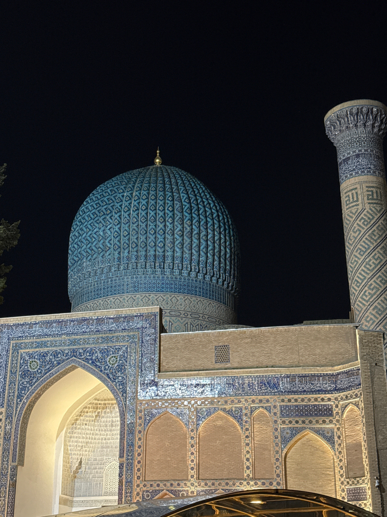 The image depicts a section of the Gur-e-Amir mausoleum in Samarkand City, Uzbekistan, illuminated at night. The most prominent feature is the ribbed, blue-tiled dome, decorated with geometric pattern…read more