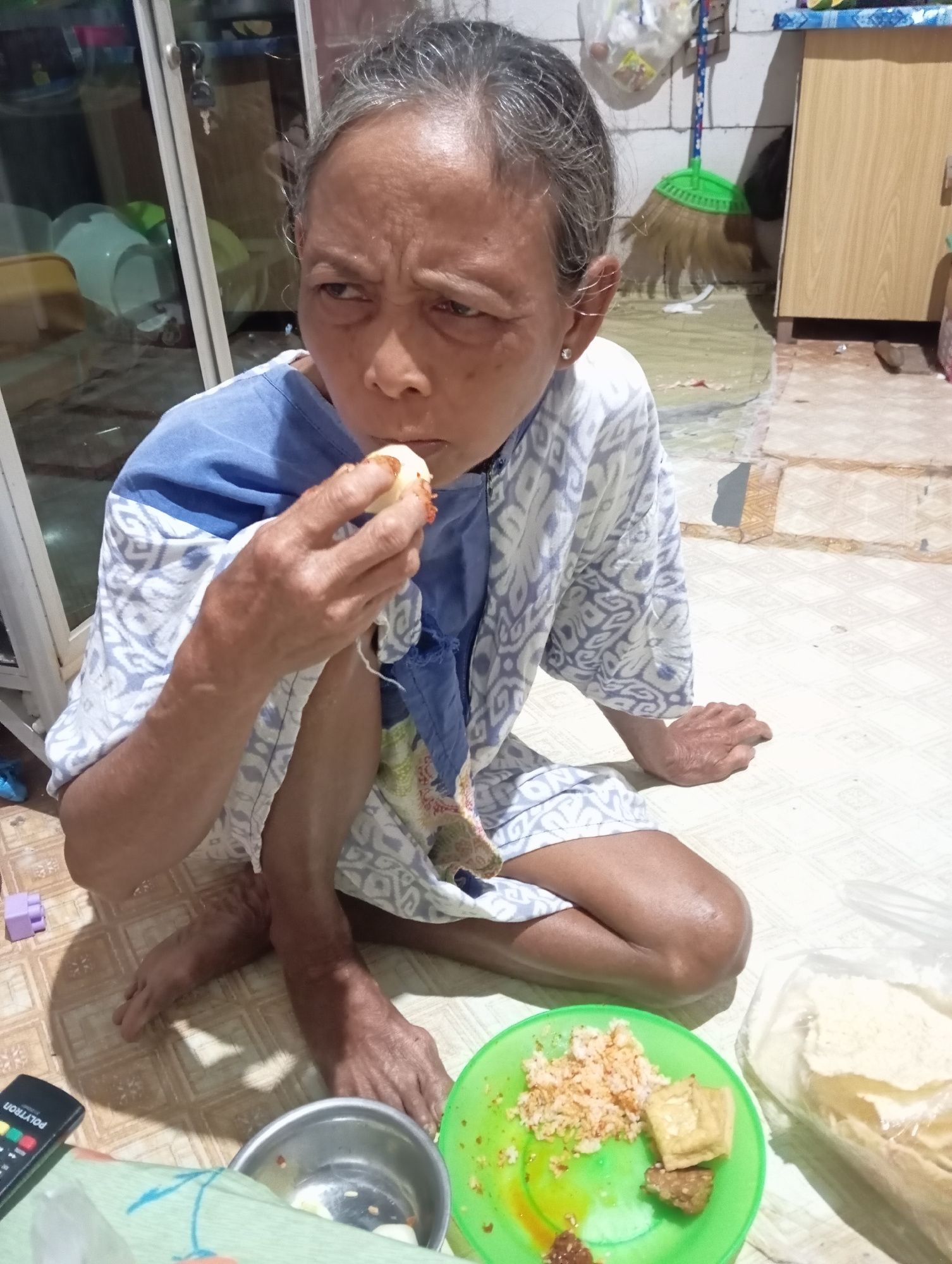 An elderly Asian woman with short gray hair sits on a tile floor in a residential setting. She is dressed in a blue shirt and a white patterned robe or jacket and is eating something from her hand. A…read more