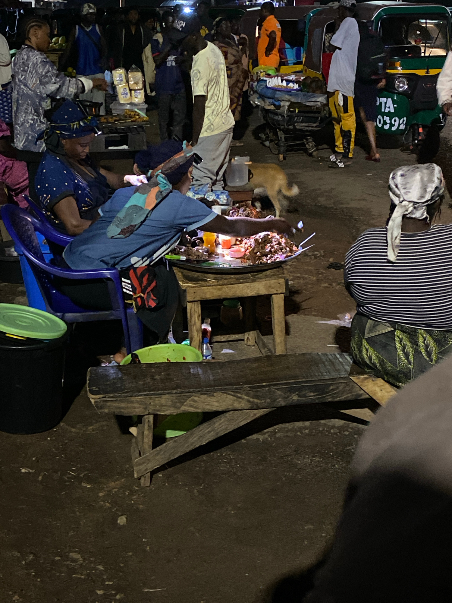 This image depicts a bustling street scene in Bukuru, Nigeria, at night. Several people are visible, seated and standing, around various makeshift stalls or tables. A woman wearing a striped top and h…read more
