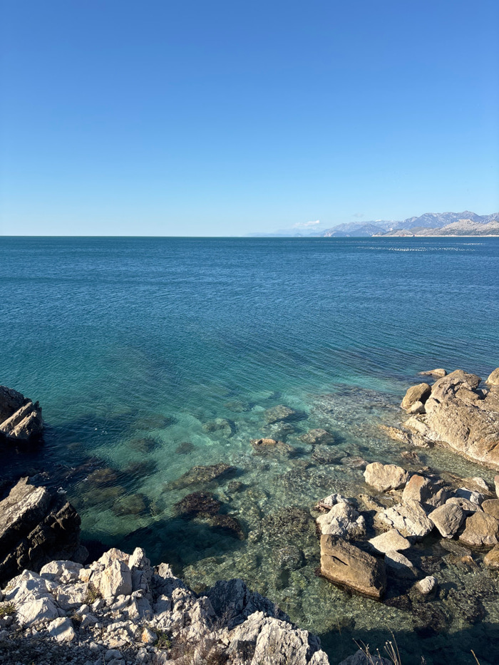 The image displays a coastal scene in Kunje, Montenegro, under a clear, bright blue sky. The top third of the frame is dominated by the unobstructed sky. The middle portion features the Adriatic Sea,…read more