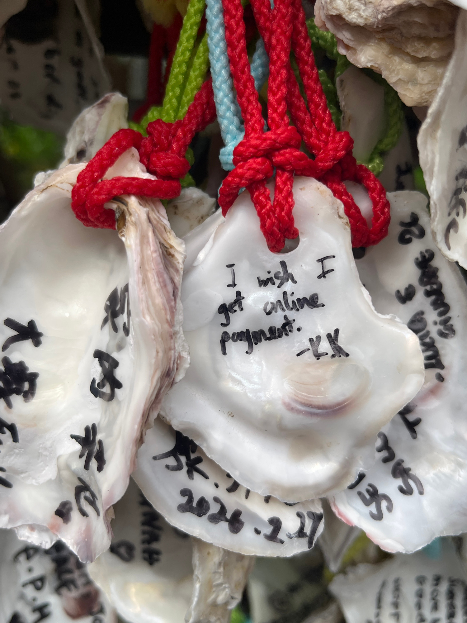 The image depicts a collection of oyster shells with wishes written on them in both English and Japanese, tied together with red, green, and blue cords. The wish written in English is "I wish I get on…read more