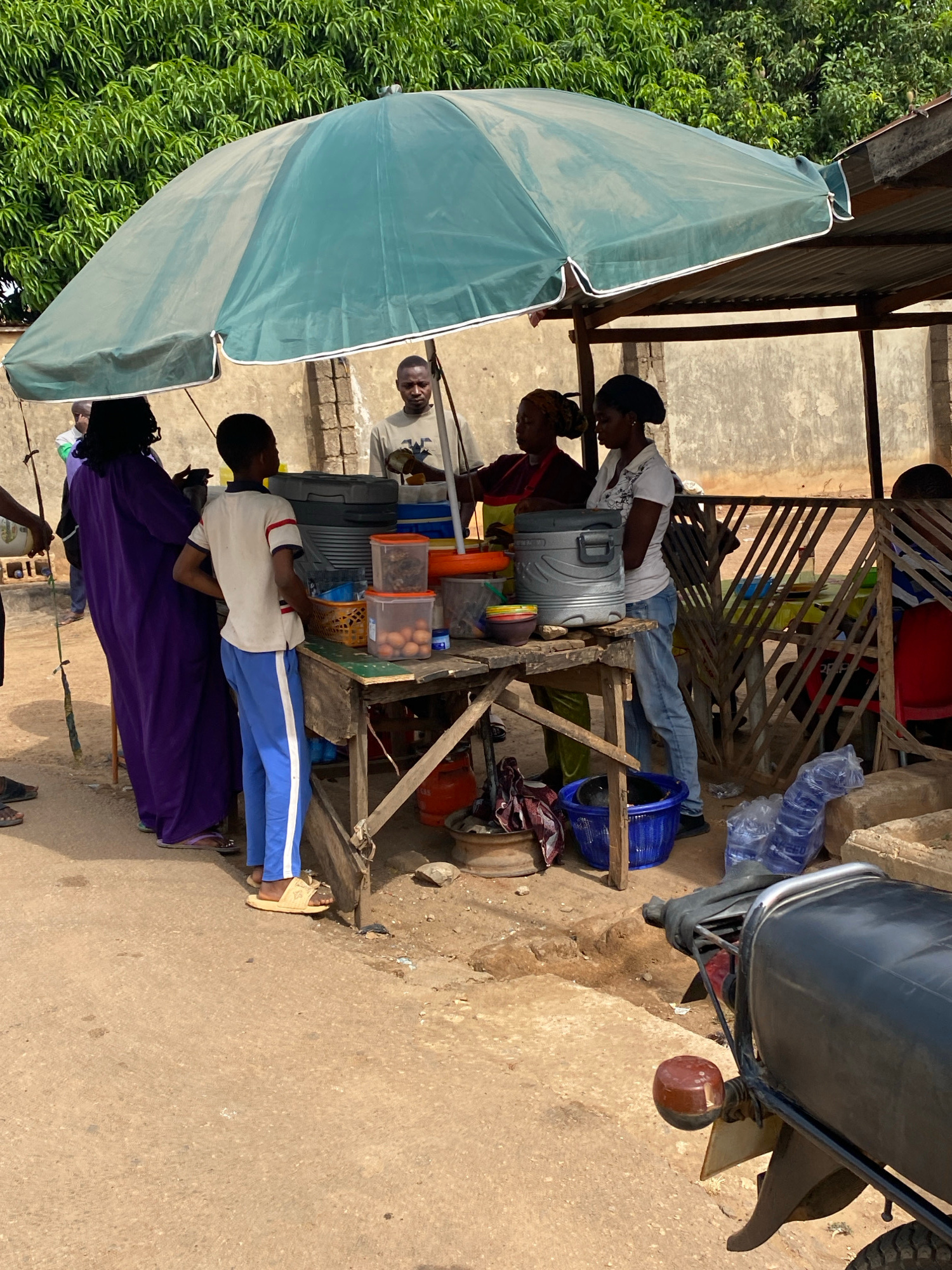 The image shows an outdoor scene in Narayi, Nigeria. Under a makeshift shelter with a large blue umbrella, people are gathered around a food or refreshment stand. A couple of women seem to be working…read more
