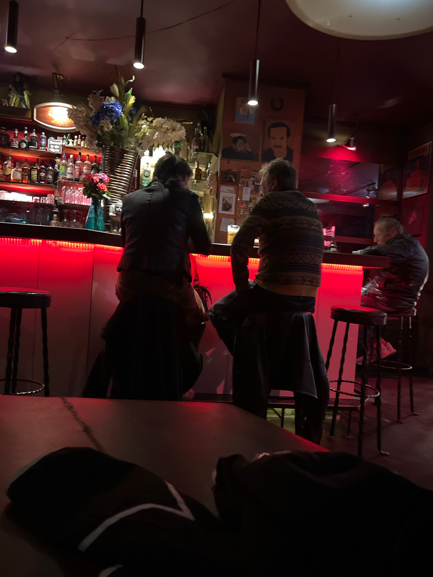 The image shows the interior of a bar in Berlin, Germany. The bar is illuminated with red lighting behind the counter. Several people are standing at the bar. One man is wearing a patterned sweater. A…read more