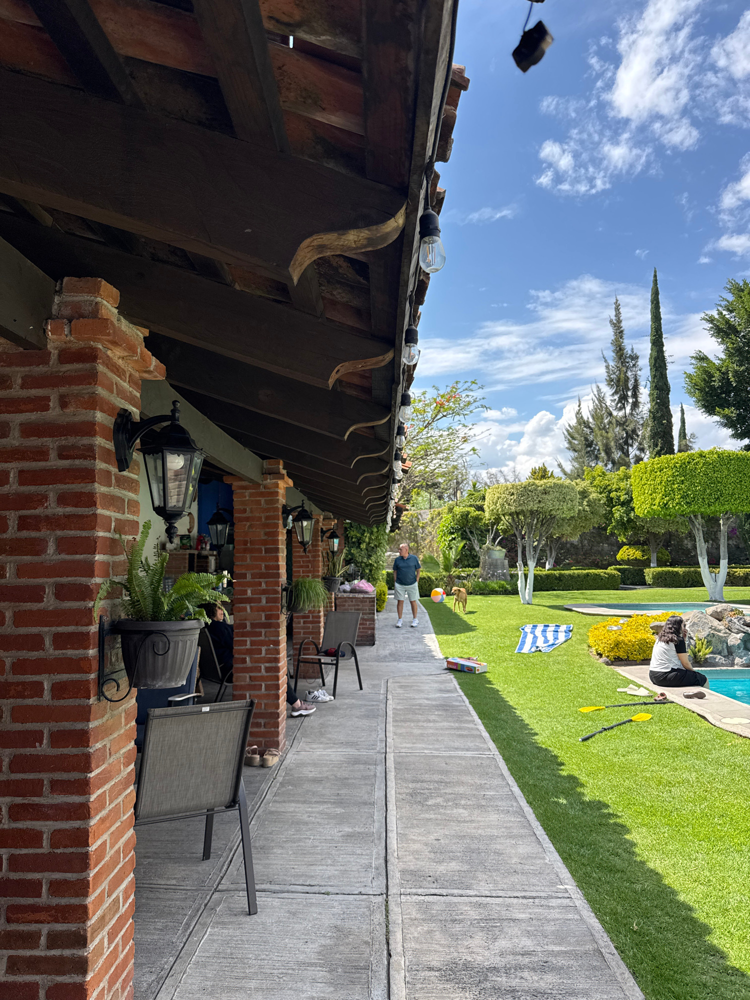 The scene is an outdoor space in Puebla, Mexico, featuring a brick structure with hanging lanterns and potted ferns in the foreground. Behind it, a concrete walkway leads to a green lawn area. On the…read more