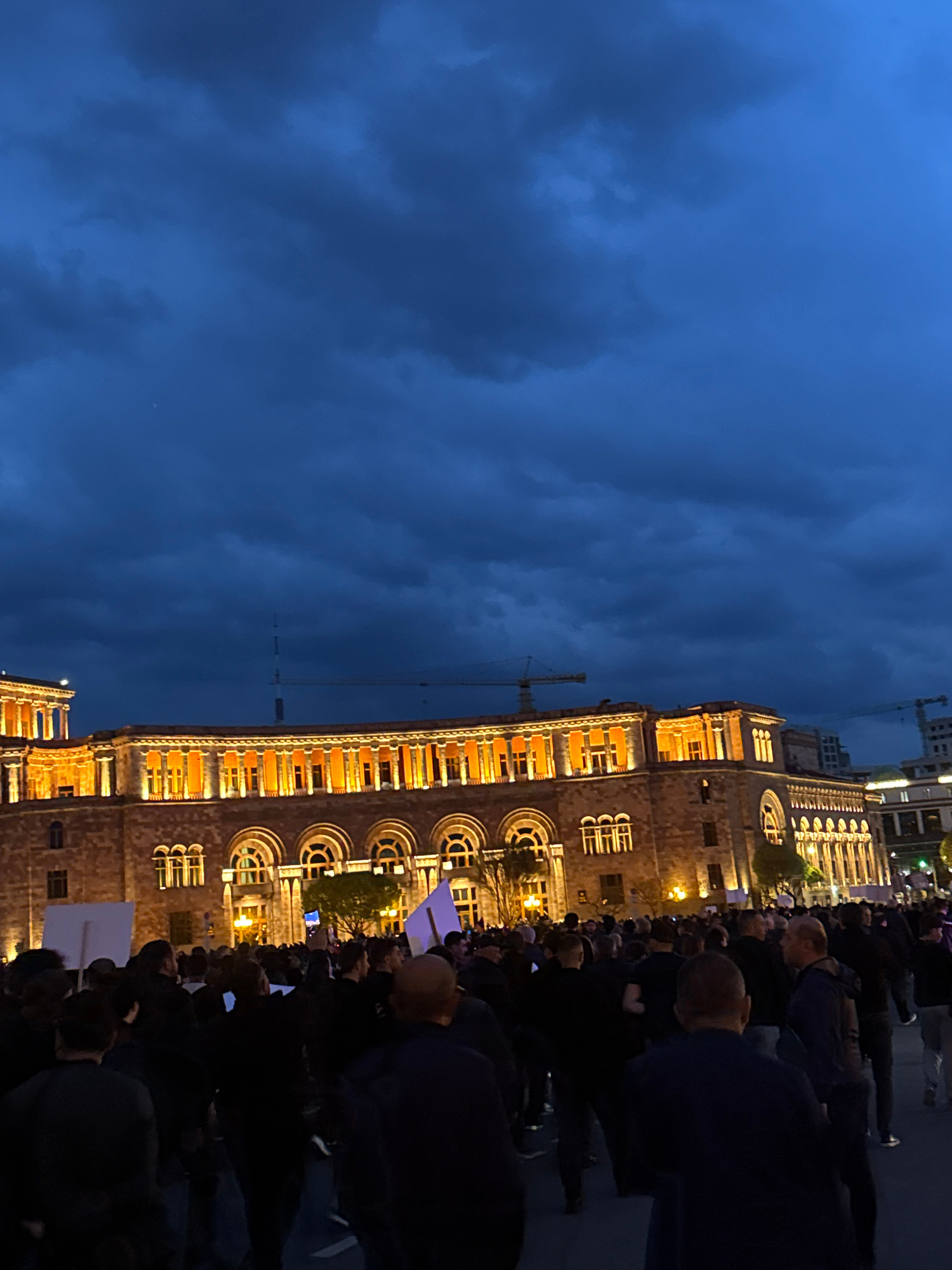 The image shows a crowd of people gathered in front of a large, illuminated building in Yerevan, Armenia. The building is multi-storied and constructed of stone with rows of arched windows. A construc…read more