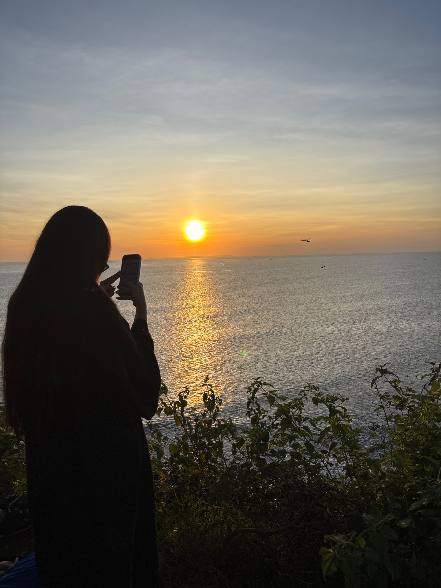 A medium-shot captures a person's silhouette taking a photograph of a sunset over the ocean. The sky transitions from a lighter grey-blue to a bright orange where the sun is positioned. Sunlight refle…read more