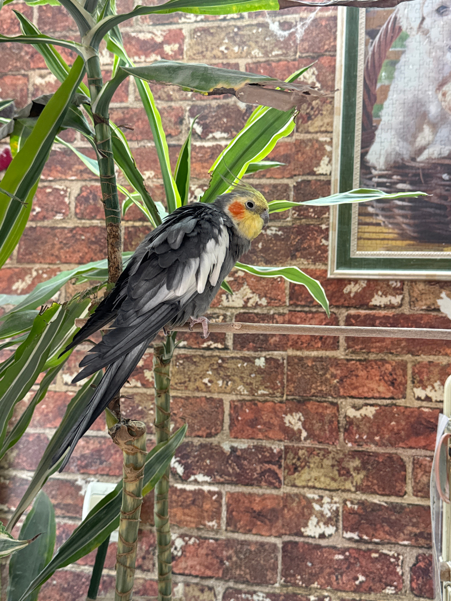 A grey and yellow cockatiel sits on a green plant. The cockatiel has an orange spot on its face. The background is a red brick wall. A framed puzzle is visible in the upper left corner. The location i…read more