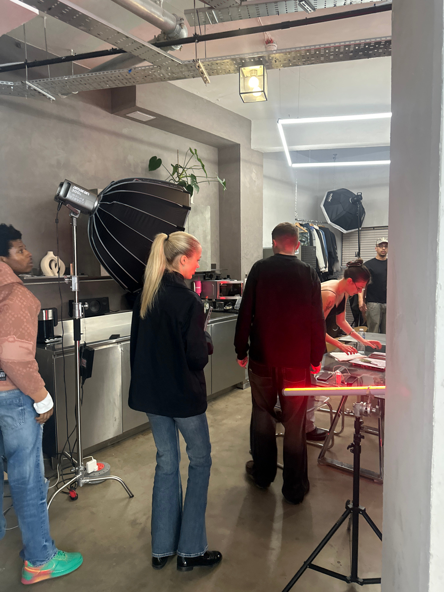 The image captures an indoor professional photoshoot or video shoot in London, United Kingdom, set within a modern, industrial-style studio or commercial space. The environment features concrete walls…read more