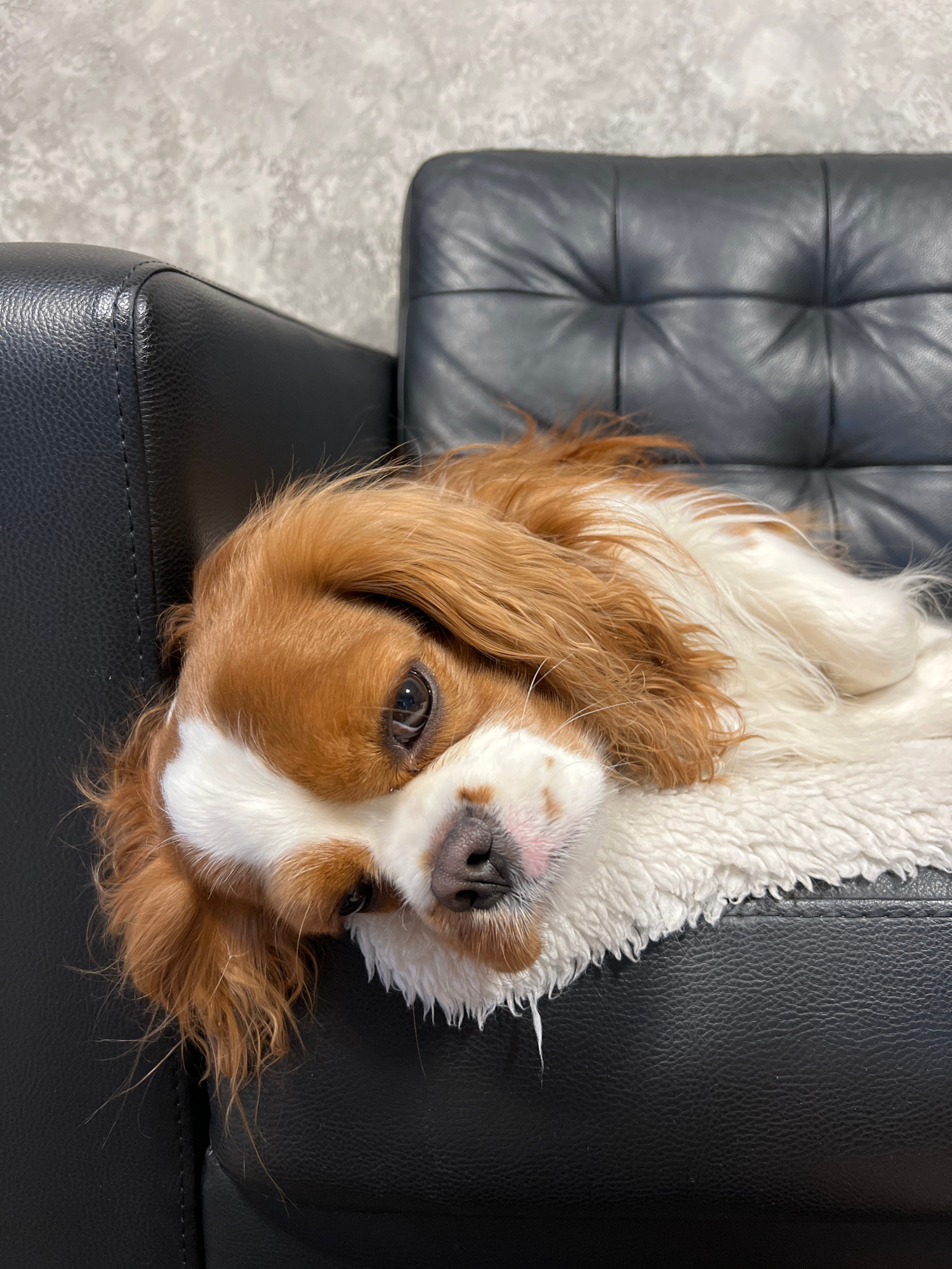 A Cavalier King Charles Spaniel is lying upside down on a black leather couch. The dog's head is positioned on the armrest of the couch. The couch has a tufted backrest visible in the upper left of th…read more