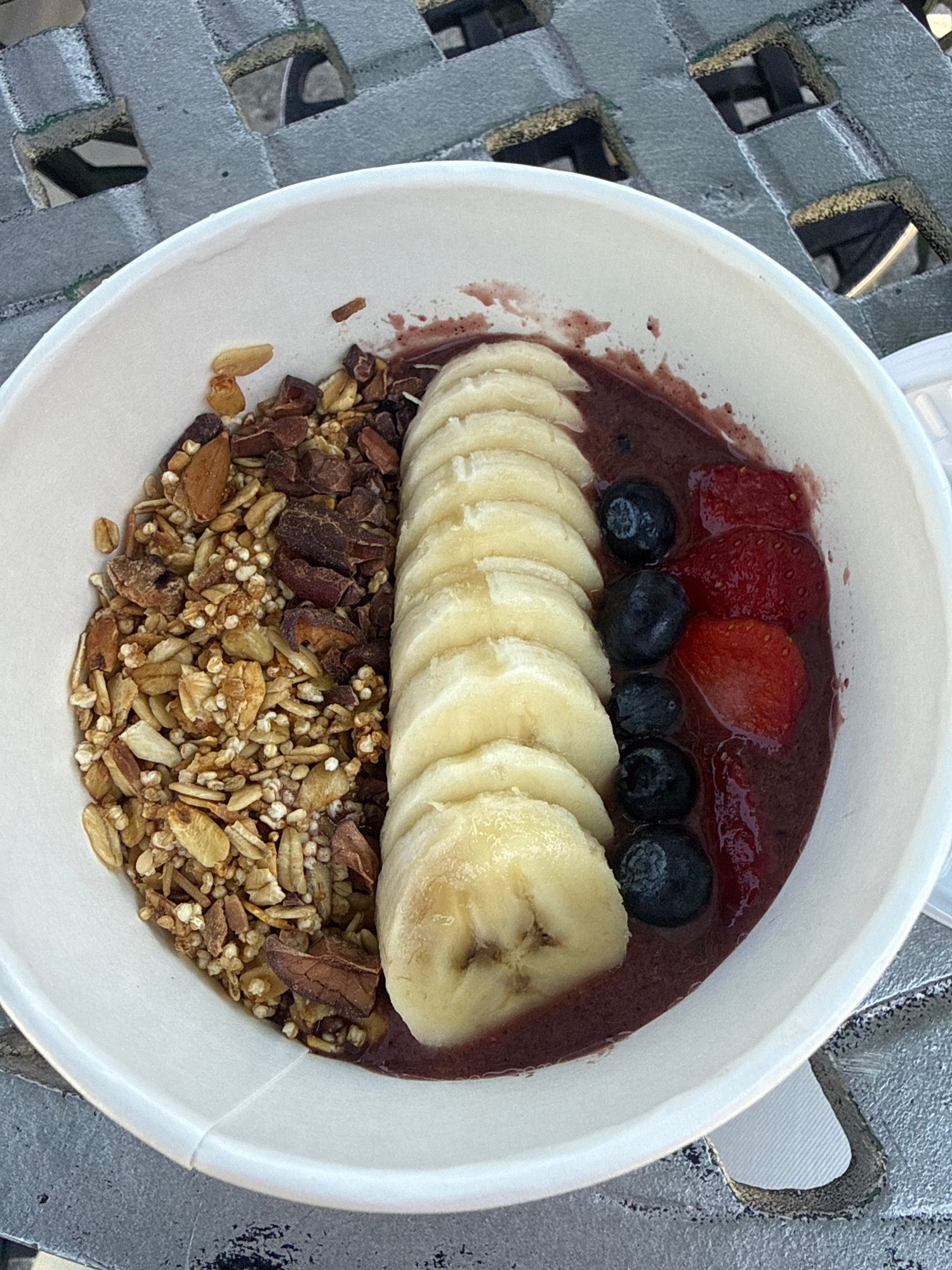 The image shows an acai bowl in a white paper bowl, likely photographed outdoors in daylight. The bowl contains a dark purple acai base topped with sliced strawberries, blueberries, sliced bananas, an…read more