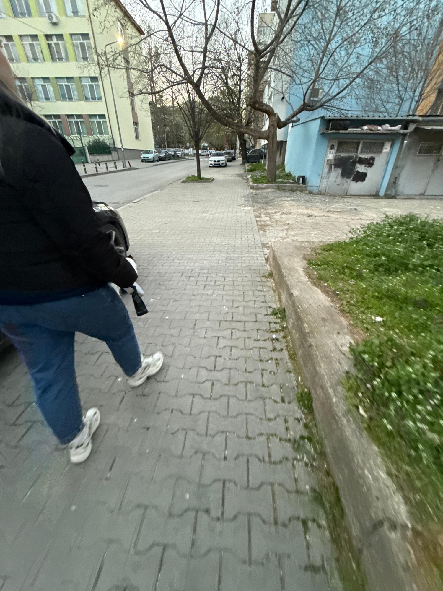 A first-person perspective image shows a person walking on a brick sidewalk in Stara Zagora, Bulgaria. The person is wearing blue jeans and white sneakers. The sidewalk is made of gray bricks with a dā¦read more