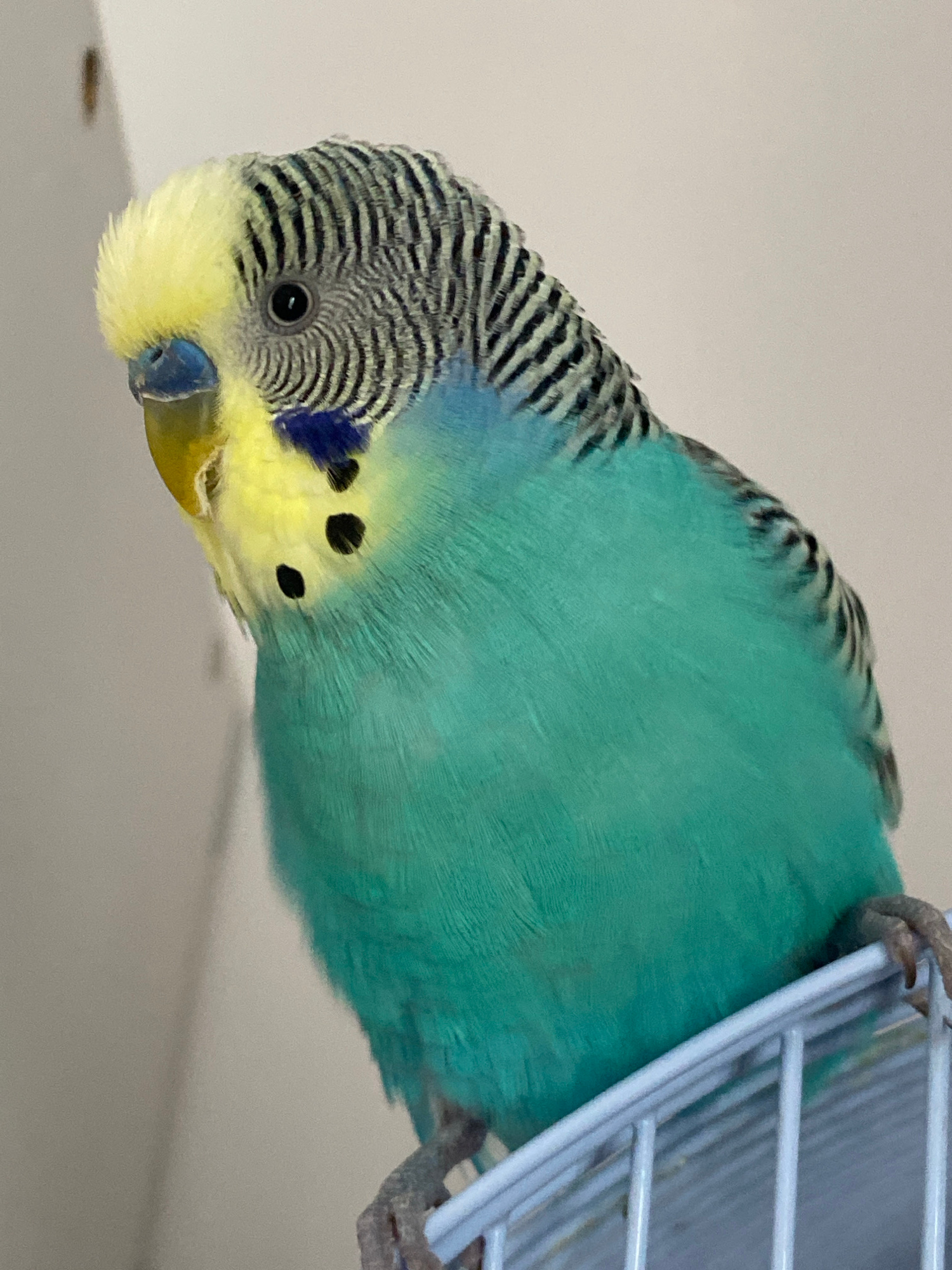 A turquoise and yellow budgerigar is upside down clinging to a white wire cage. The budgerigar has black stripes on its head and neck, with a blue and yellow face and black spots near the beak. The bi…read more