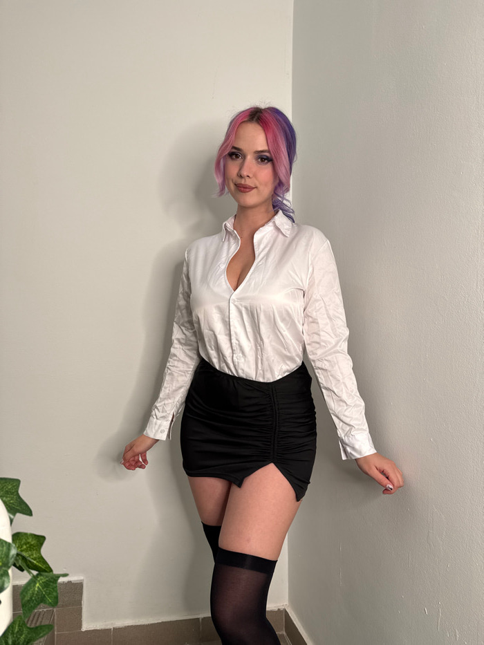 An image depicts a single young adult female standing indoors in what appears to be a corner of a room. The individual is positioned centrally, facing the camera directly, and exhibits a slight smile.…read more
