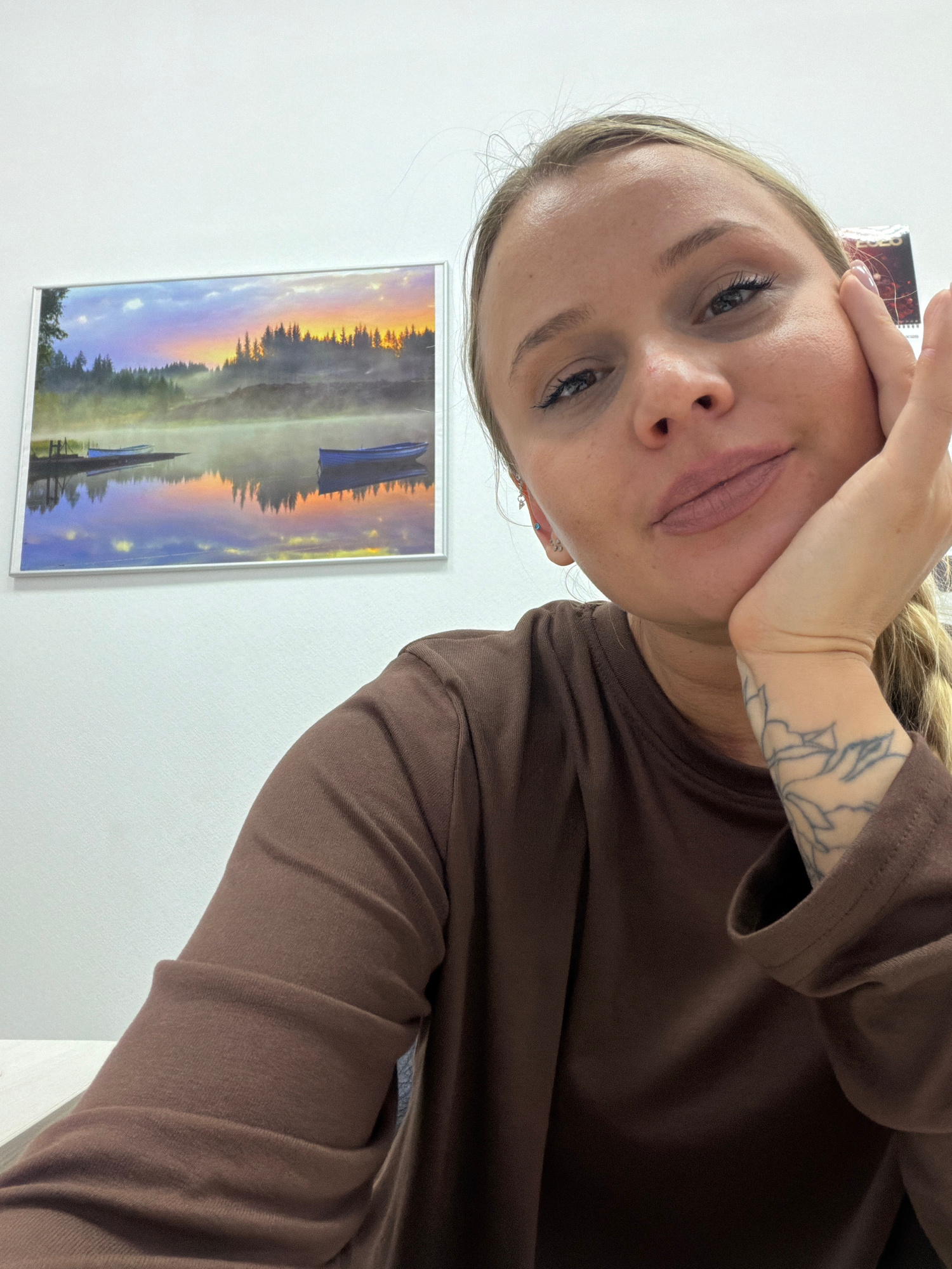 A woman with blonde hair and a brown long-sleeved shirt poses indoors. She rests her head in her hand, revealing a tattoo on her forearm. Behind her is a framed picture of a lake landscape at sunset o…read more
