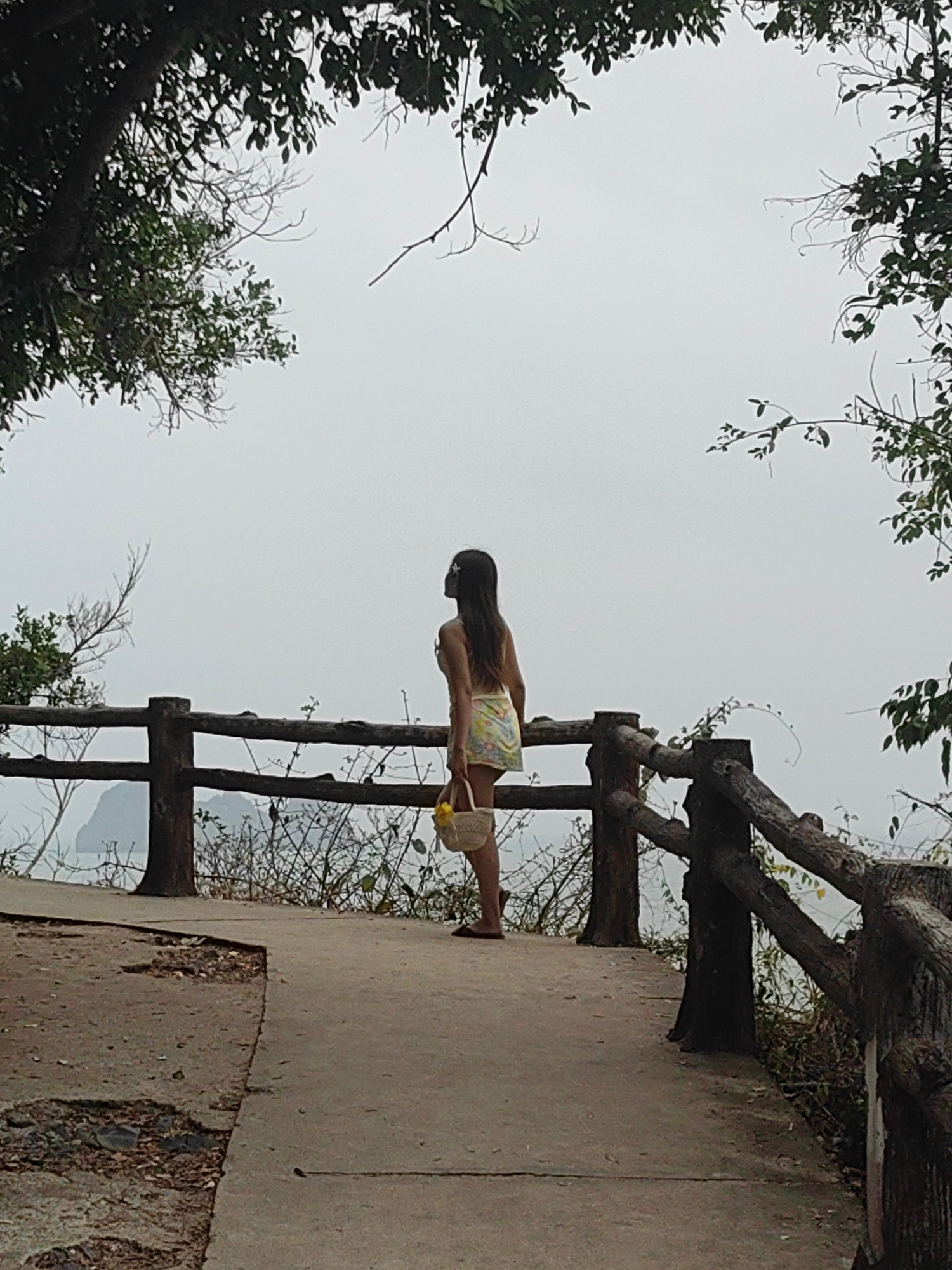 A woman stands on a weathered concrete platform bordered by a rustic wooden fence overlooking a hazy landscape. The woman has long, dark hair and is wearing a light-colored top and a floral-patterned…read more
