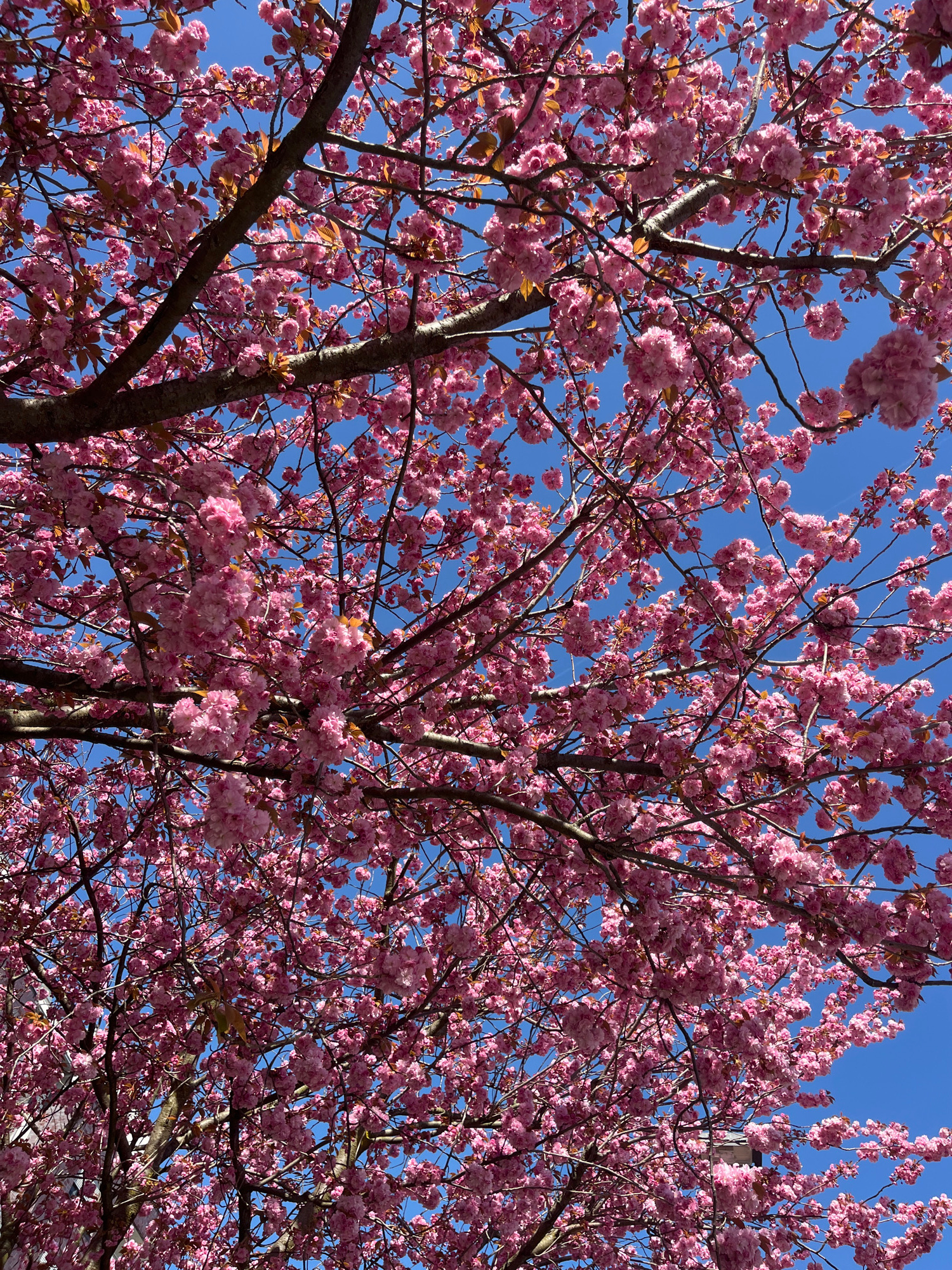The image depicts a cluster of pink cherry blossom trees against a clear blue sky. The trees are in full bloom, with dense clusters of pink flowers obscuring much of the branch structure. Some branche…read more