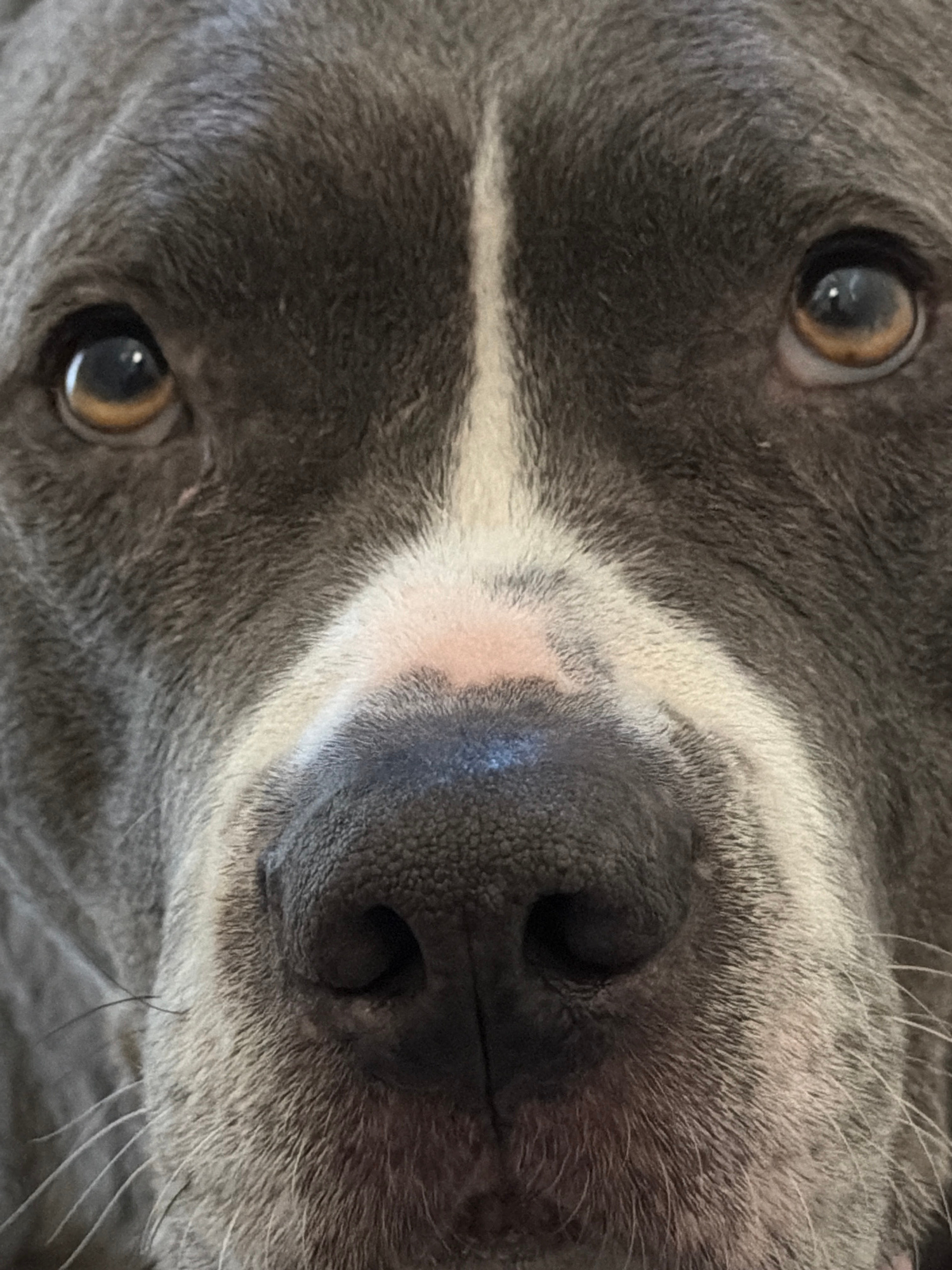 A close-up, rotated image of a gray and white dog's face. The dog's nose is large and black with two nostrils, positioned centrally in the frame. Above the nose, a white stripe extends upwards between…read more