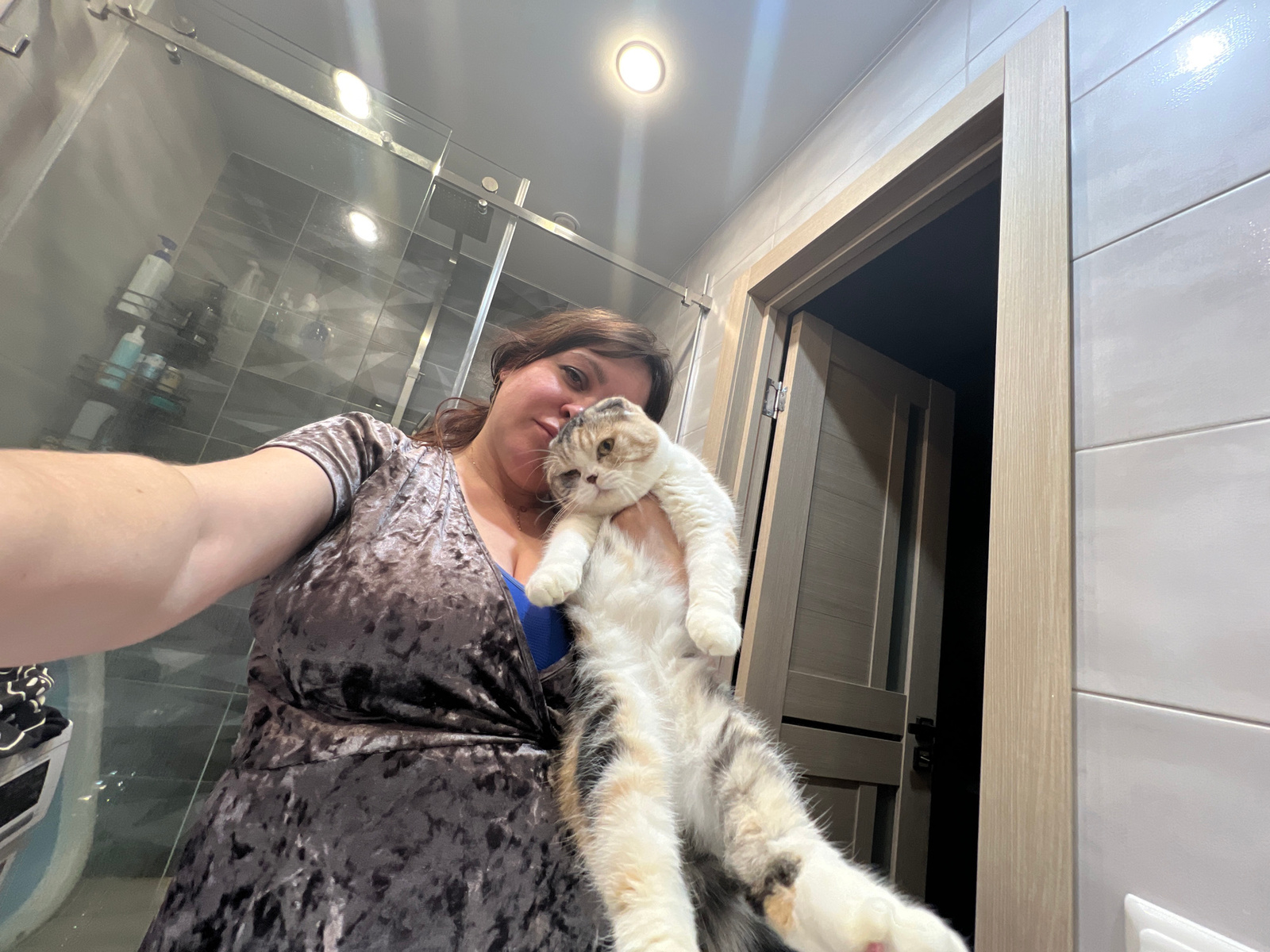 A woman is holding a cat. The location is inside a bathroom with light grey tiles and a glass shower screen, and a door with a light wooden frame. No location can be confirmed from the information in…read more