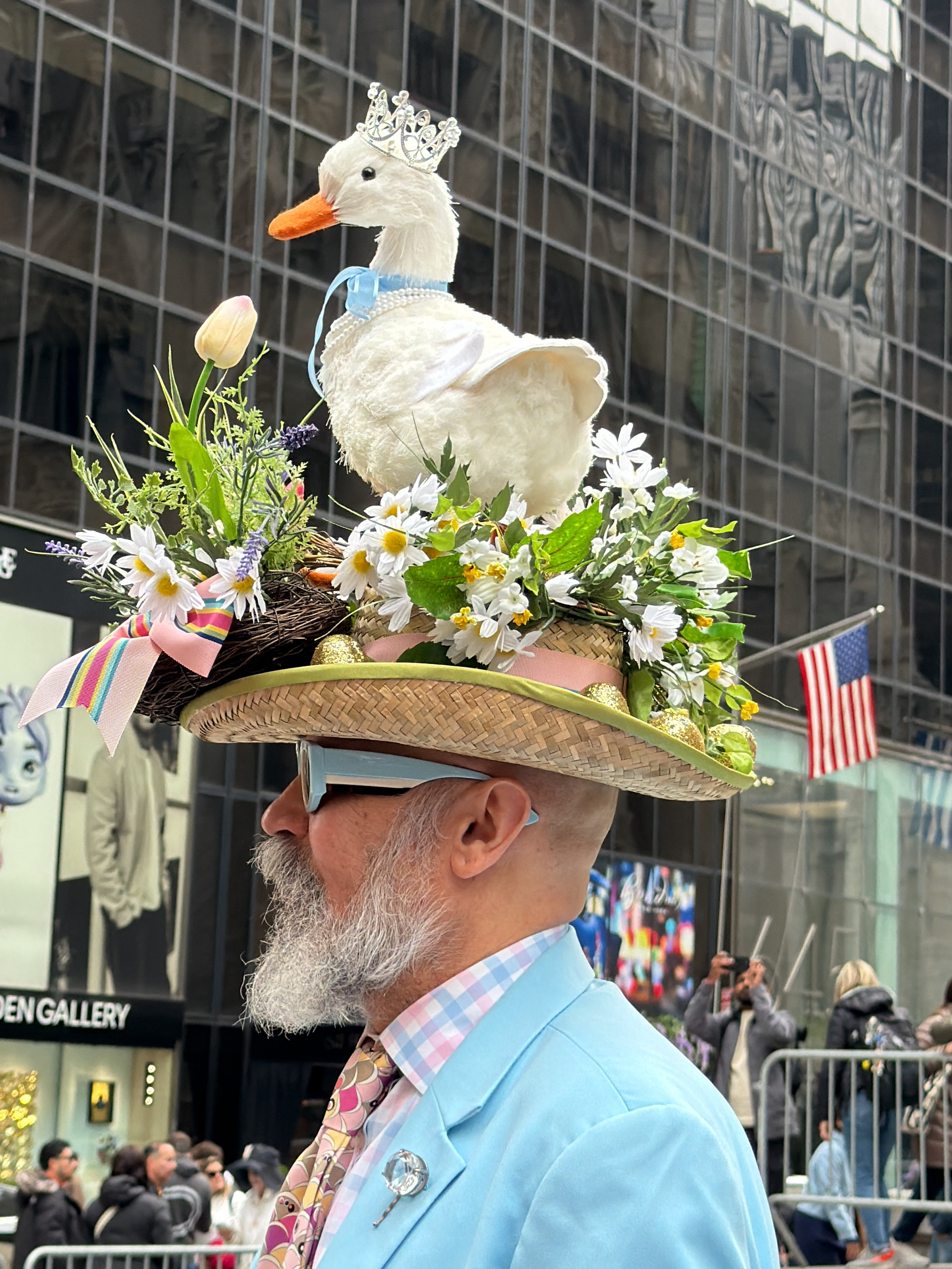 A close-up shot shows a person wearing an elaborate Easter hat standing in a city. The hat is a wide-brimmed straw hat decorated with flowers, a small nest, and a white stuffed duck wearing a crown an…read more