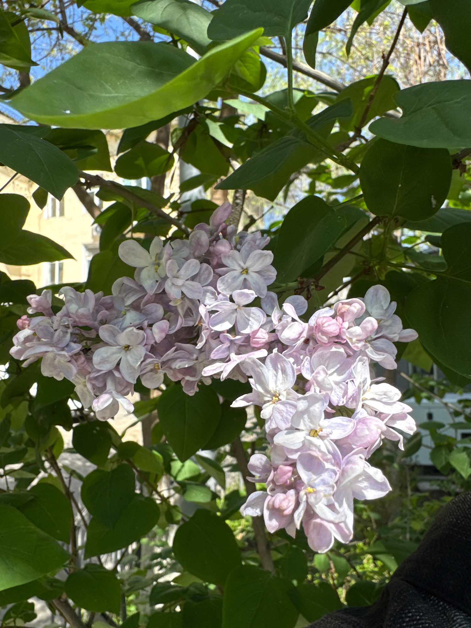 The image shows a cluster of light purple and white lilac flowers in full bloom, surrounded by green leaves of the lilac bush. The flowers are densely packed in conical shapes. The leaves are broad an…read more