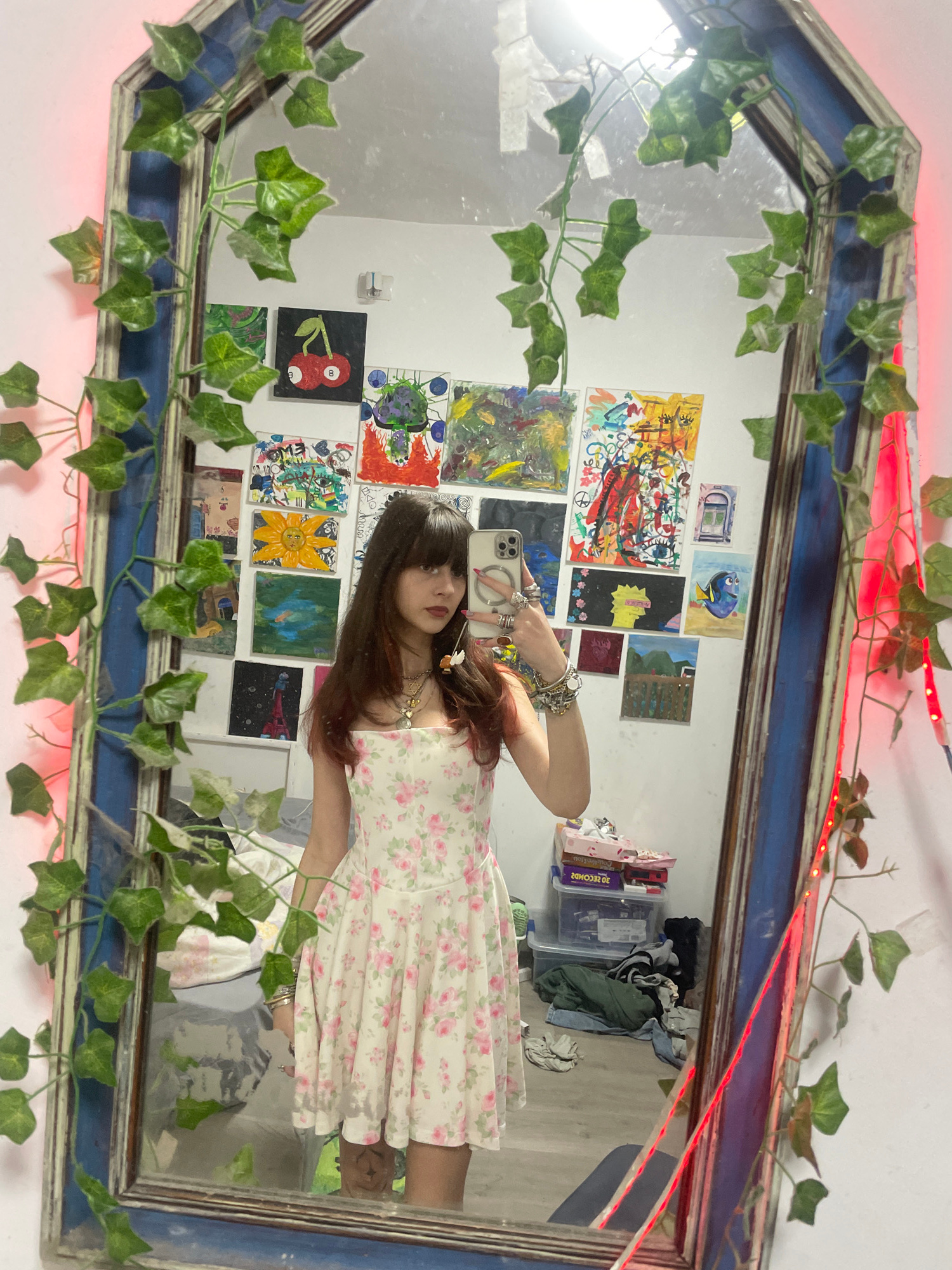 A young woman is reflected in an ornate, framed mirror adorned with faux ivy and red LED strip lights. She is holding a smartphone and appears to be taking a selfie. She is wearing a light-colored dre…read more