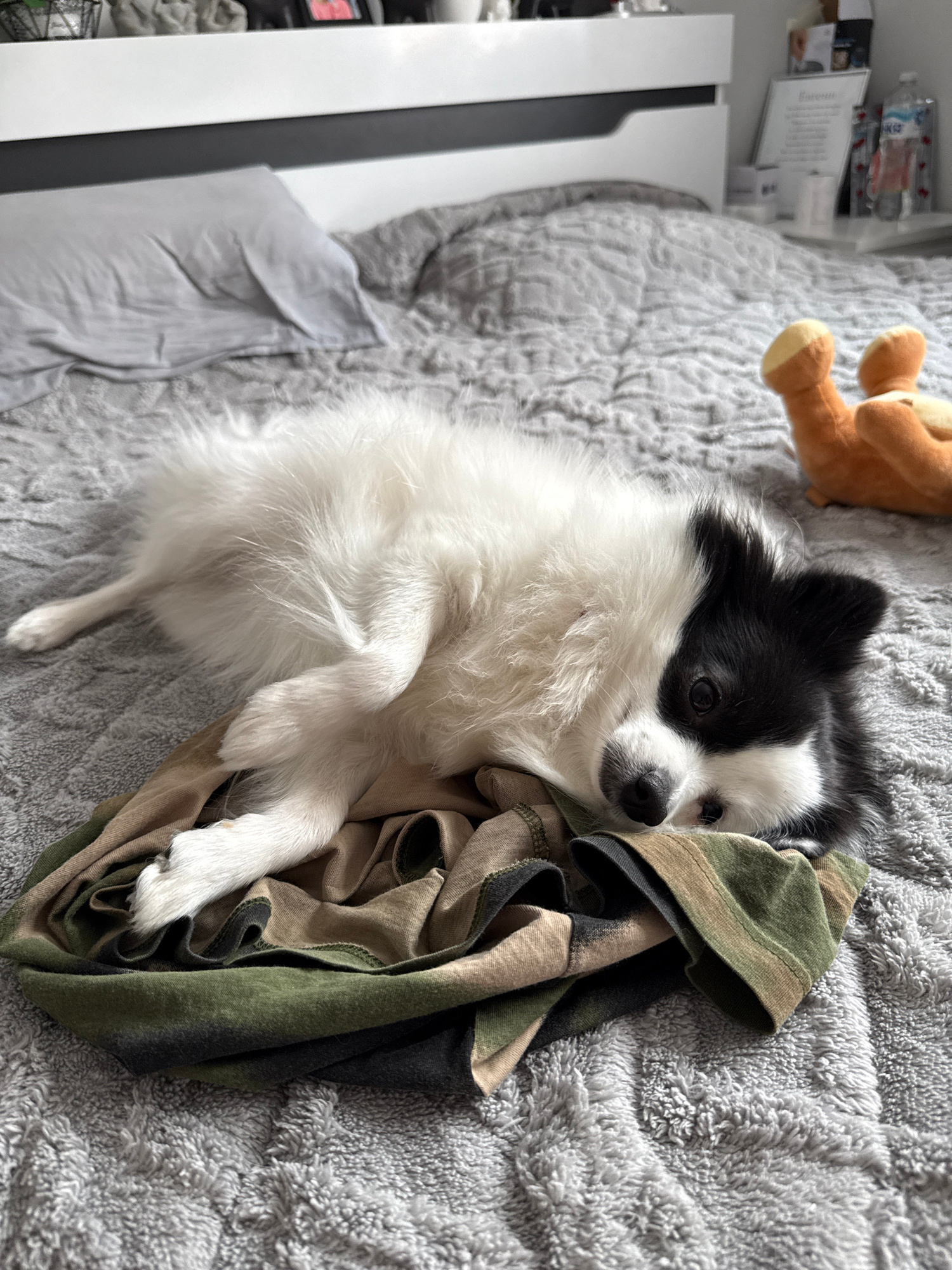 A black and white long-haired dog lies on a gray textured blanket. The dog rests its front paws on a folded camo-patterned t-shirt. Part of a stuffed bear toy is in the upper left. A white dresser and…read more