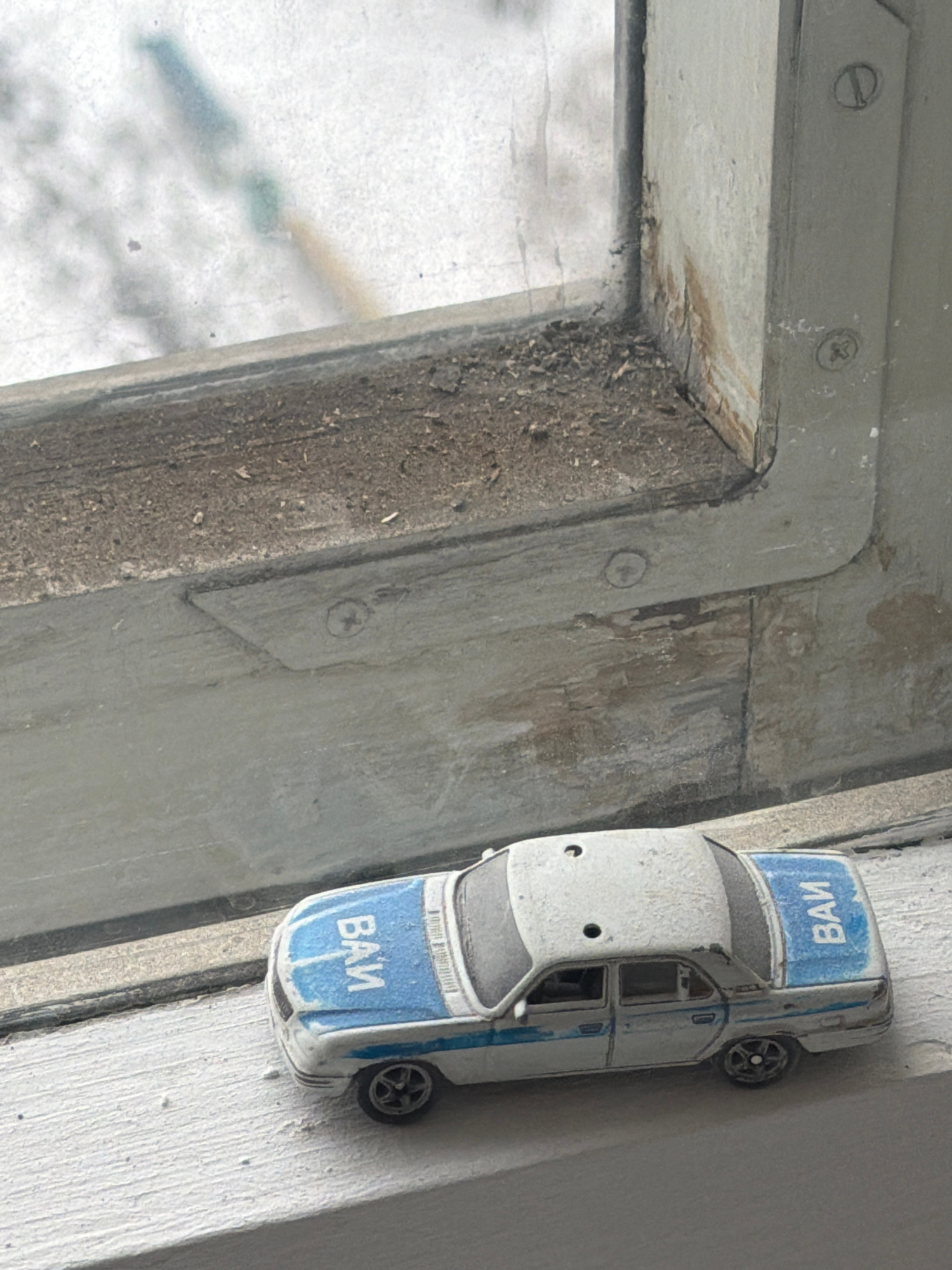 The image displays a close-up, slightly vertical perspective of a dusty white toy car positioned on a grimy window frame next to a dirty window. The scene appears to be indoors, looking out. The toy…read more