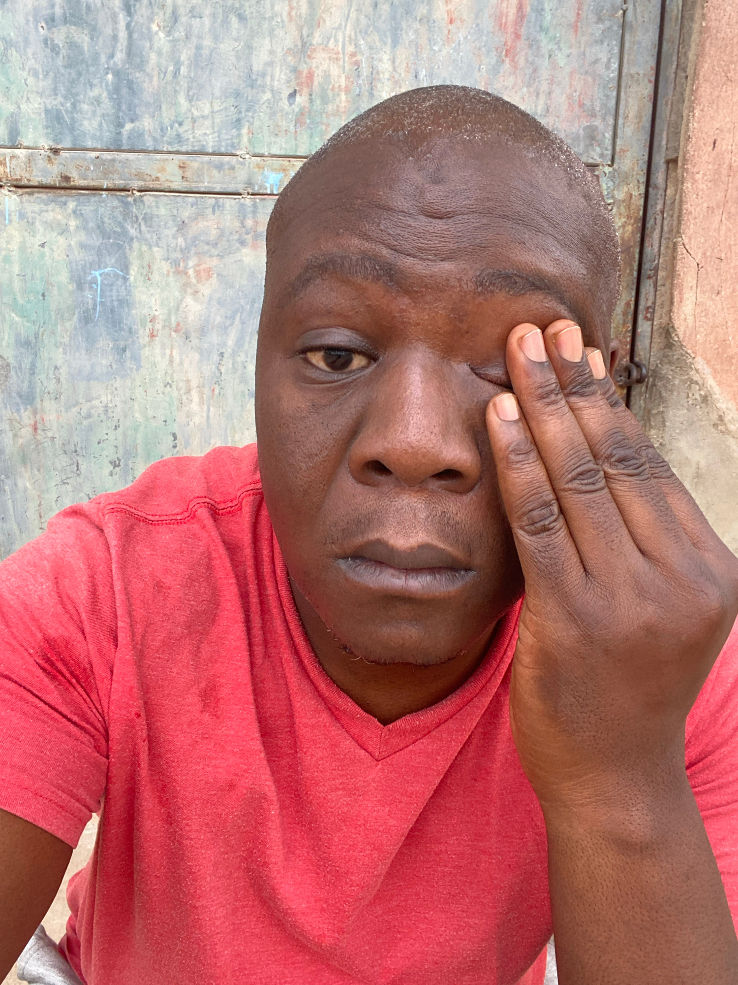 A close-up shot depicts a bald, dark-skinned man with a V-neck red shirt. His right hand is covering his left eye. The background consists of a wall with a weathered, metallic finish, suggesting an ur…read more