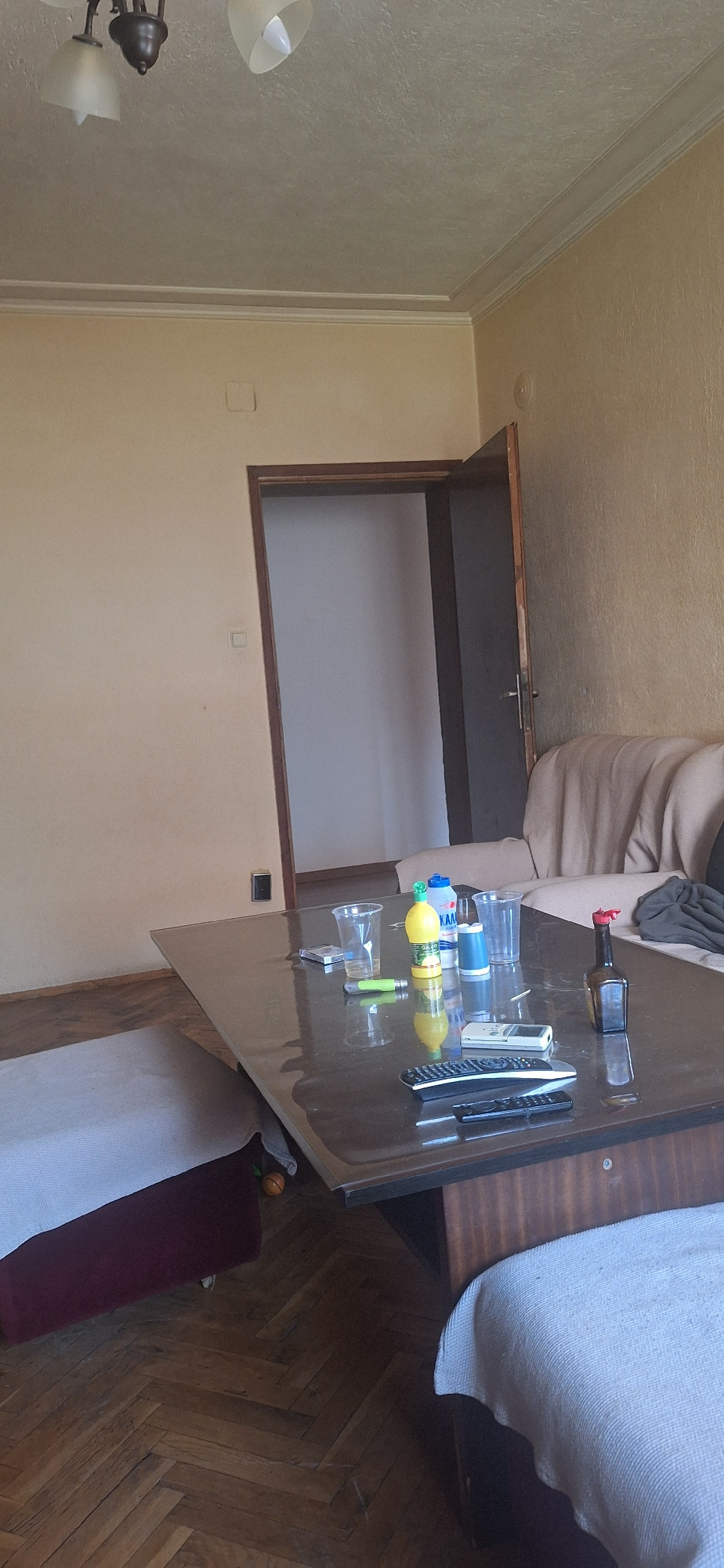 The image depicts an interior scene. A brown wooden table occupies the center of the image. On the table are several objects including a brown bottle, plastic cups, a bottle of yellow liquid and remot…read more