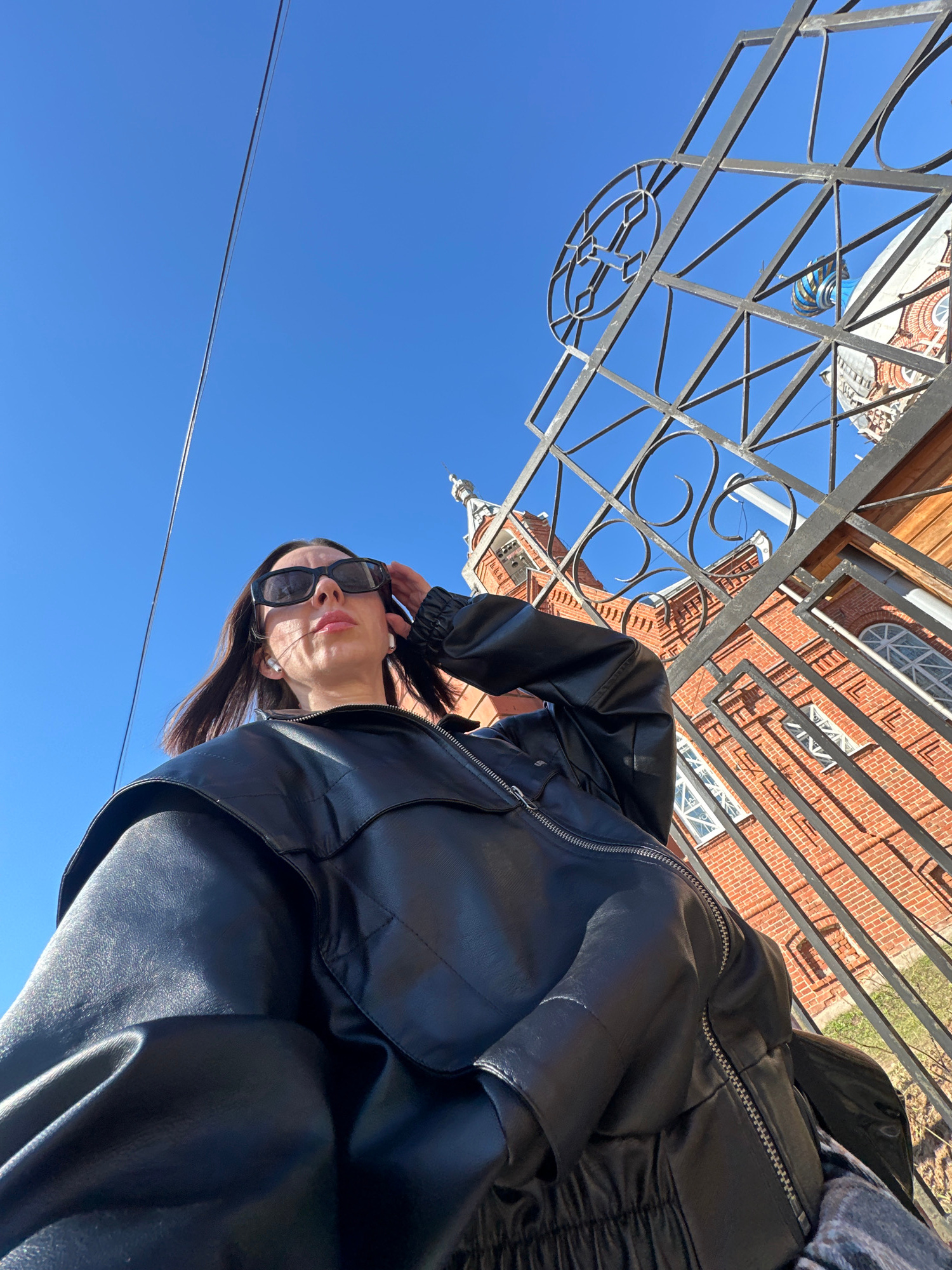 A low-angle view captures a woman in sunglasses and a black leather jacket, with a building and an ornate metal fence overhead against a clear blue sky. The building, partially obscured by the fence,…read more