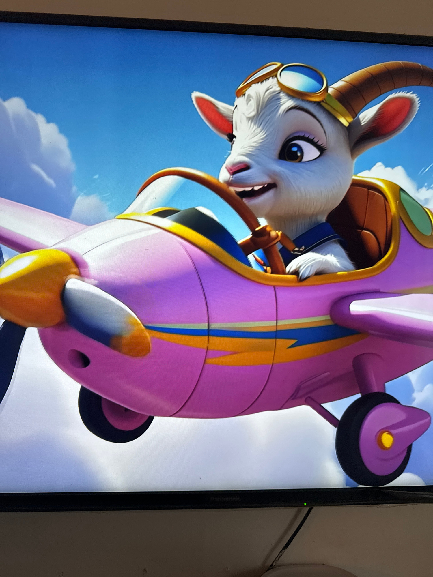 The image shows a close-up of a digital display, likely a television screen. The display features a cartoon image of a goat wearing aviator goggles and flying a pink airplane. The background depicts a…read more