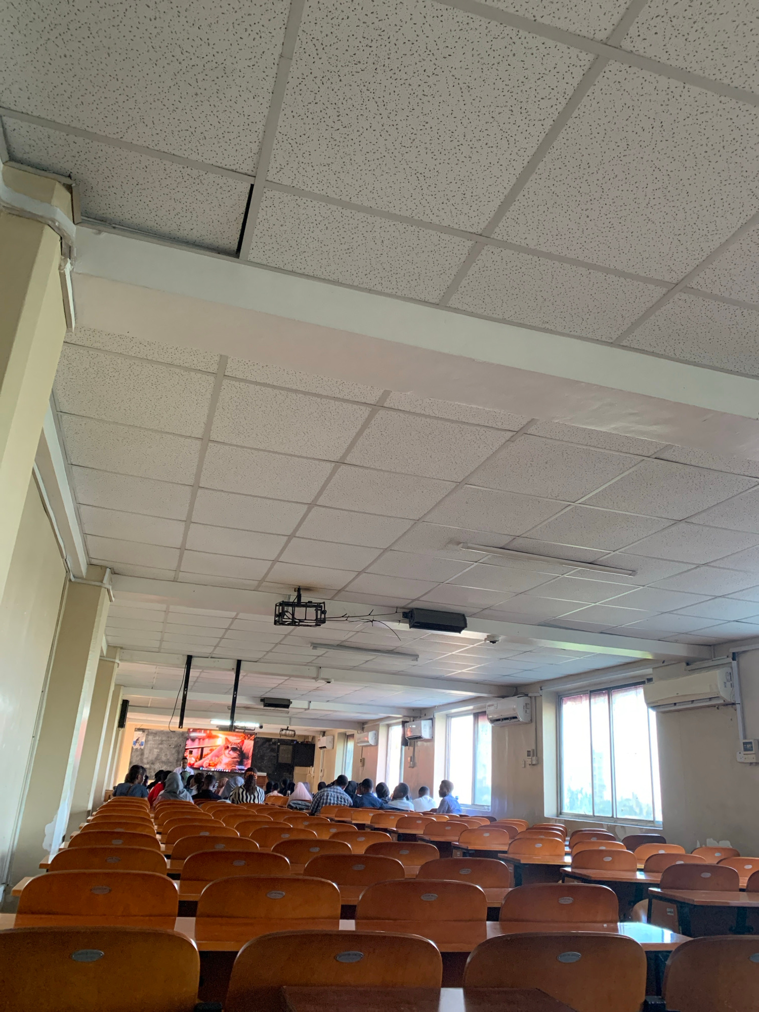 The image captures the interior of a large hall, likely a lecture room or auditorium, viewed from a slightly elevated position and rotated clockwise, causing the ceiling to appear on the left. The le…read more
